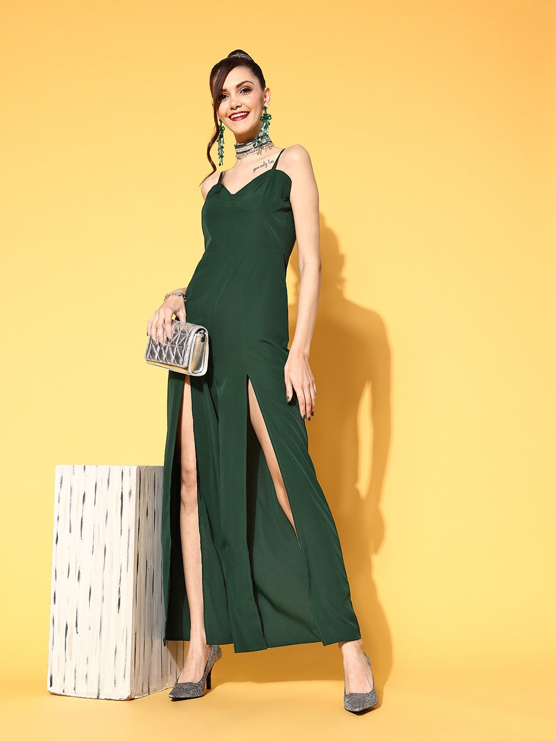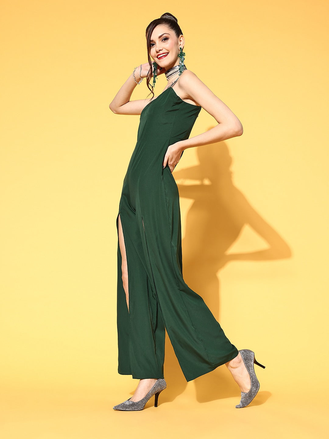 Amplify your party repertoire with the inclusion of distinguished style by selecting this glamourous Solid Green Sweetheart Neck Double-High Slit Culotte Jumpsuit introduced by Berrylush. Designed with a front slit culotte to add an eccentric essence to this jumpsuit for modern appeal. Flaunting a sleeveless feature of this jumpsuit to give your arms an alluring look along with hassle-free movement. That's not all, the adjustable shoulder straps assemble the supportive element of this jumpsuit. Pair this gorgeous jumpsuit with a pair of block heels, minimalistic silver jewellery, and a stylish sling bag for a stunning look.
