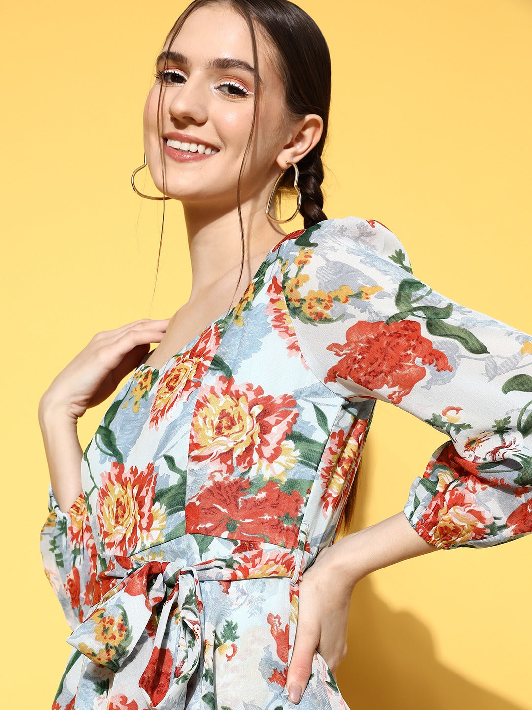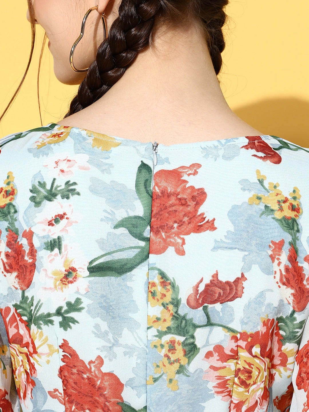 Berrylush Women Blue & Rust Orange Floral Printed Sweetheart Neck Tie-Up Waist Layered Mini Jumpsuit