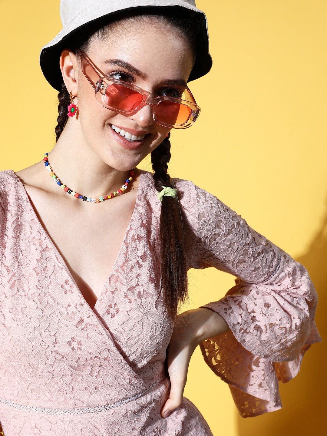 Looking for an essential and fashion-flattering acquirement for your spring closet, then the perfect statement piece is this enchanting Pink Lace Styled Back Pure Cotton Jumpsuit from Berrylush. Adorned with a beautiful lace design that lends this dress a luxurious fashion note with a captivating charm. Featuring concealed zip closure that presents a practical design of this jumpsuit which supports ease of wearing attribute. In addition, the above knee length makes this jumpsuit appear exotic with an eccentric disclosure to your legs. Get a bewitching look for your picnic date by teaming up this jumpsuit with a pair of pretty sneakers, colourful beads jewellery, a straw hat, and a trendy side bag.