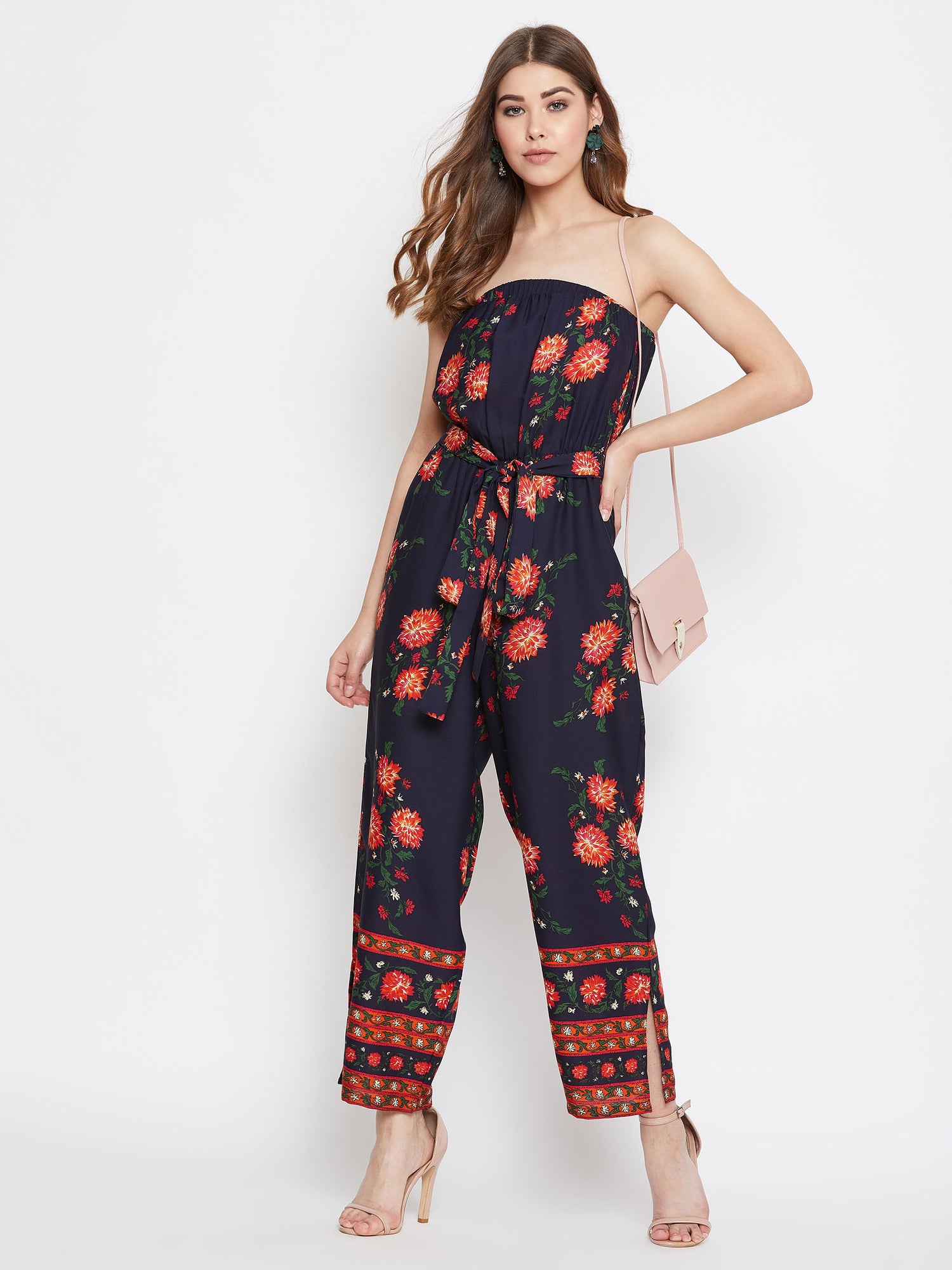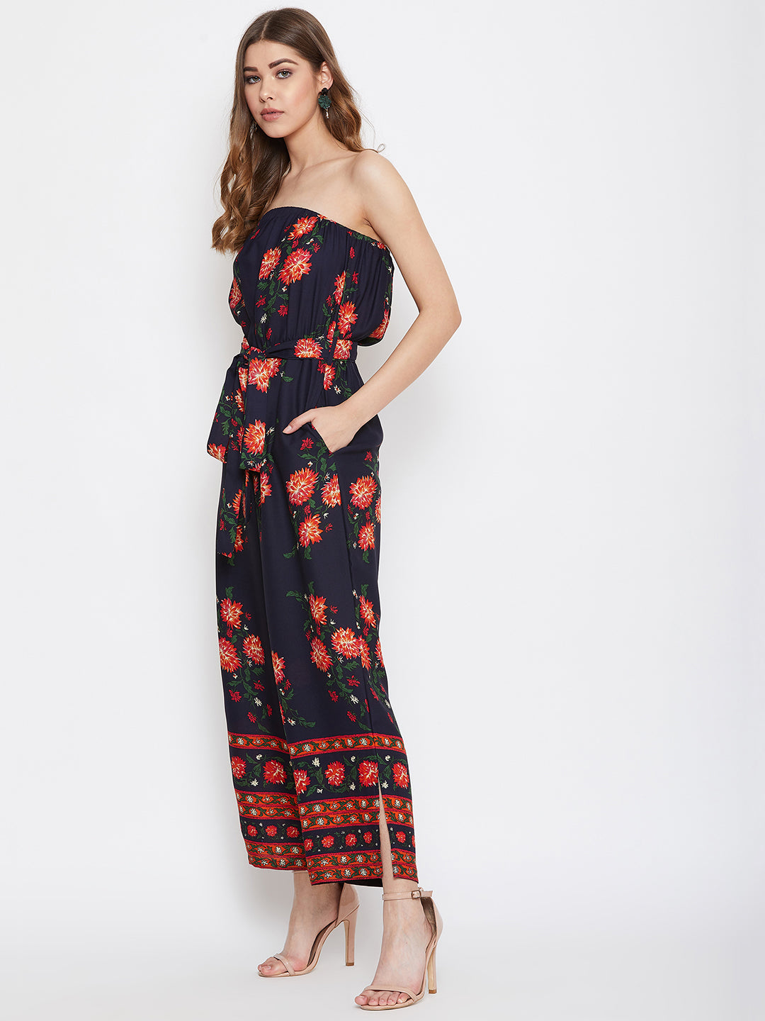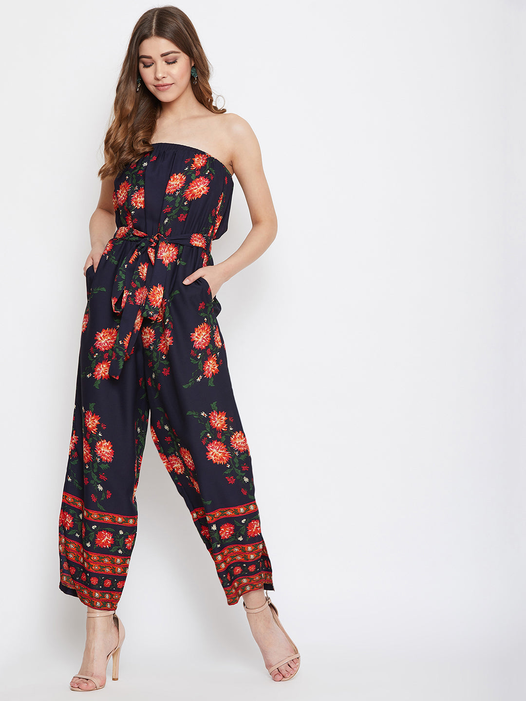 Berrylush Women Navy Blue Floral Off-Shoulder Waist Tie-Up Jumpsuit