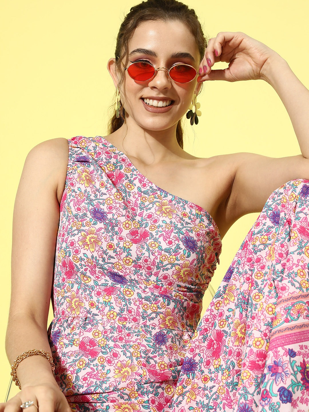 Berrylush Women Pink & Purple Floral Printed One-Shoulder Neck Sleeveless Wide-Leg Pleated Regular Jumpsuit
