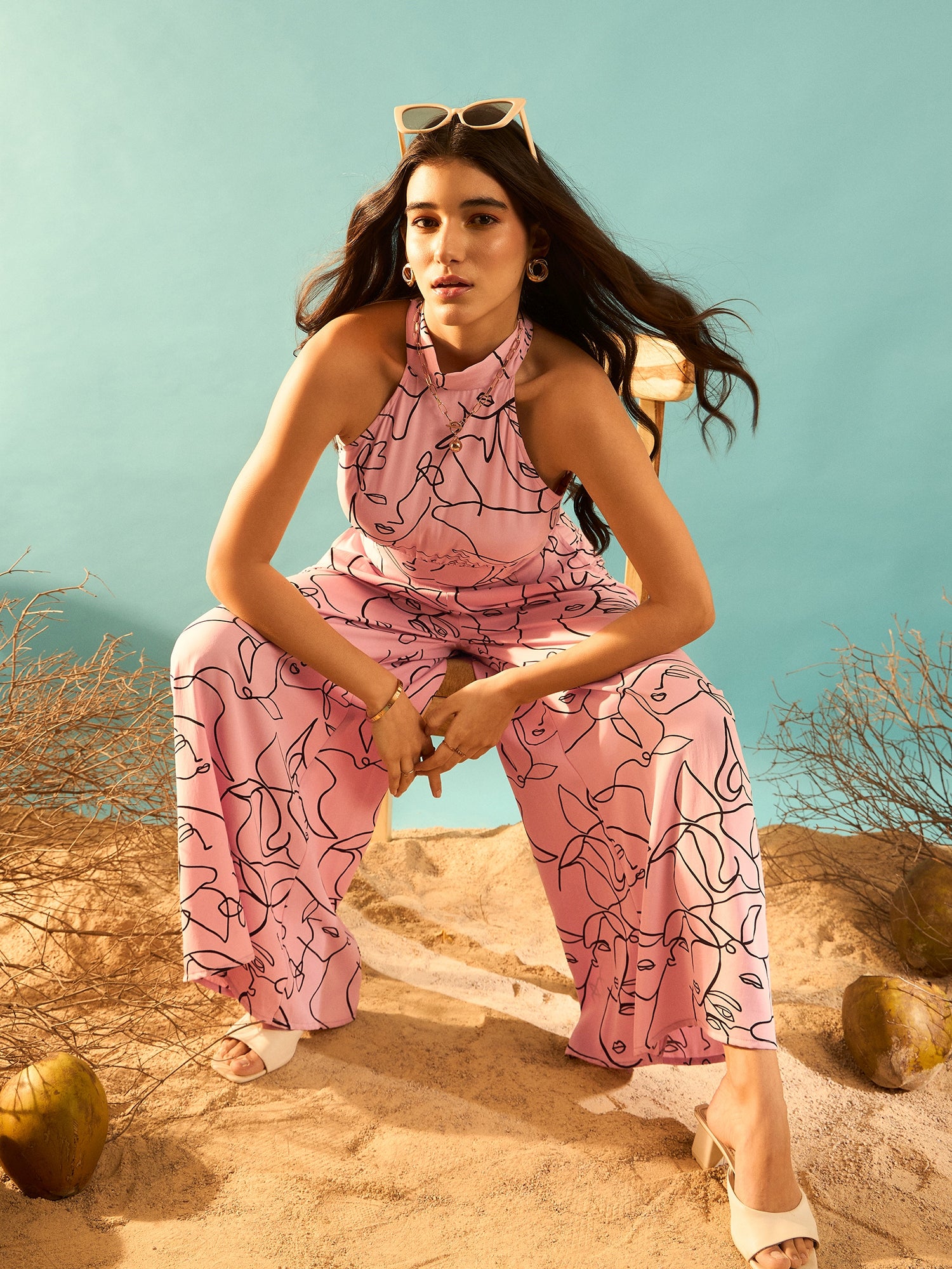 - Pink and black abstract print gives this jumpsuit a cinematic vibe