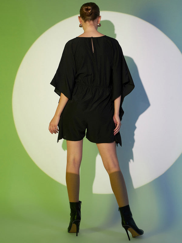 Berrylush Women Solid Black V-Neck Cape Sleeves Tie-Up Keyhole Back Straight Hem Mini Romper
