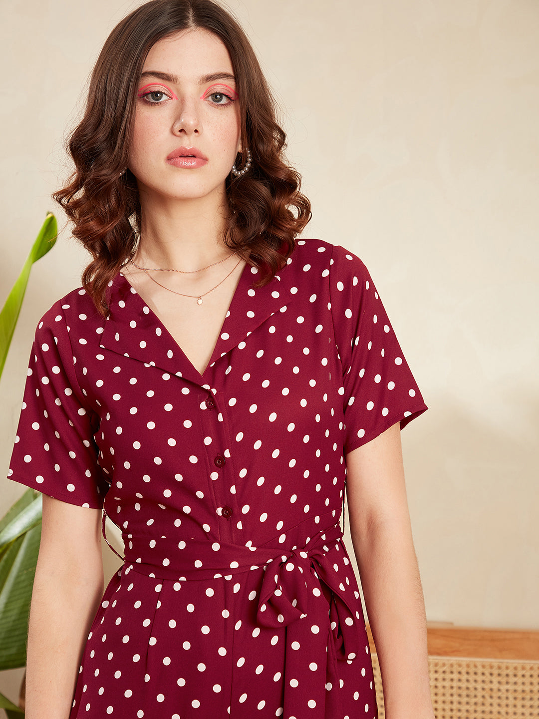 Berrylush Women Red & White Polka Dot Printed Notched Collar Neck Waist Tie-Up Maxi Jumpsuit