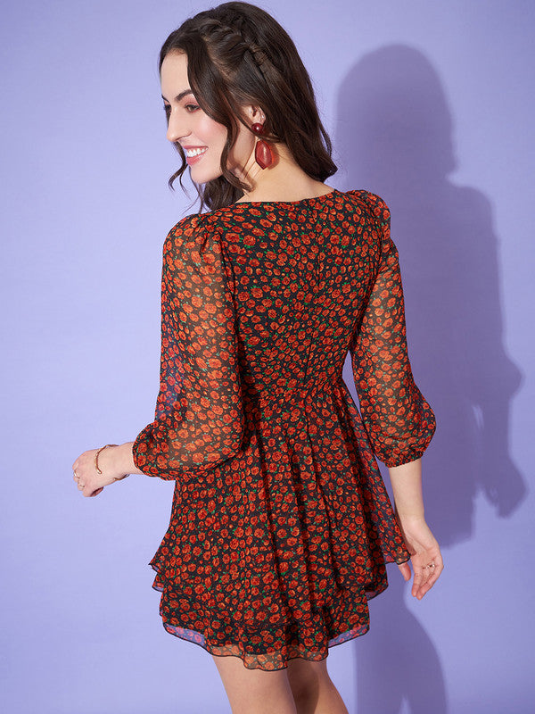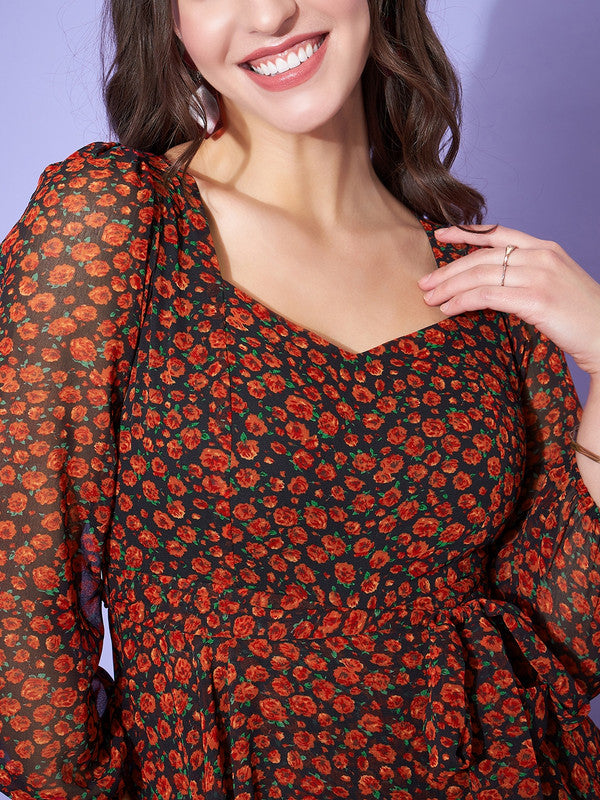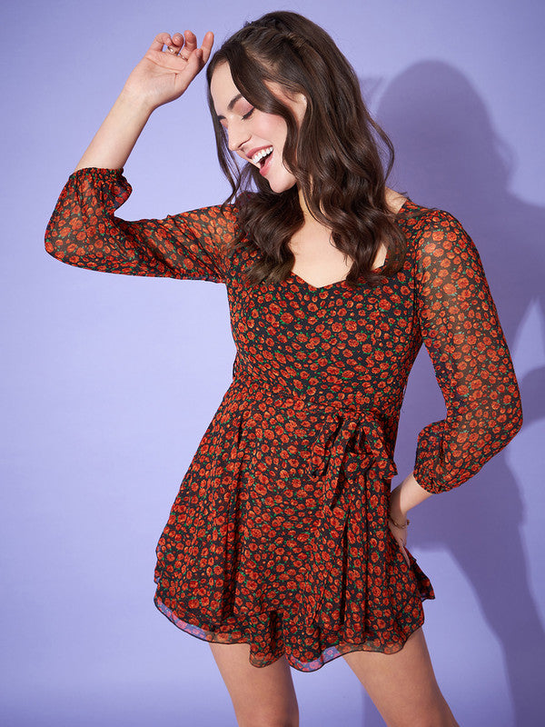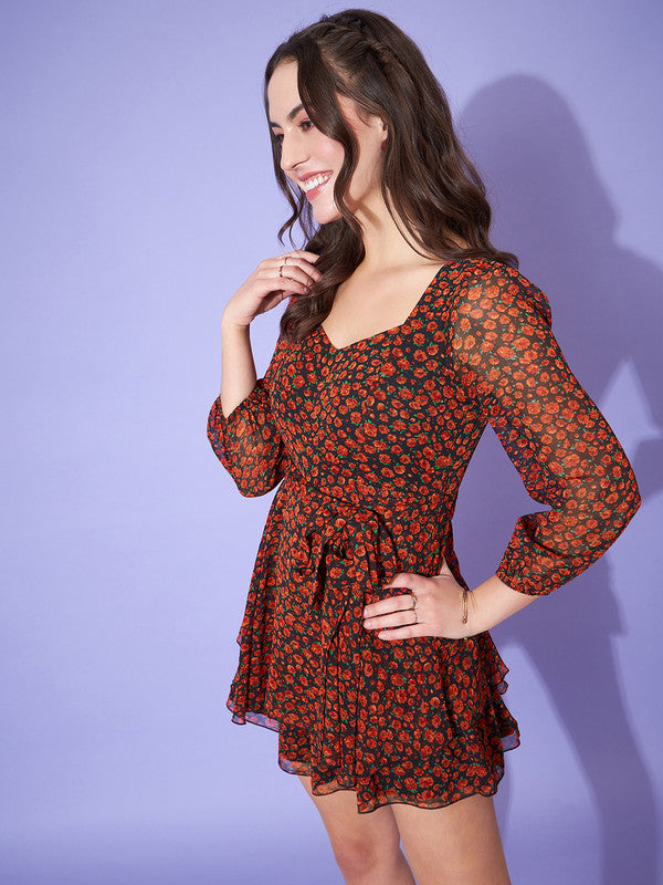 Berrylush Women Black & Red Floral Printed Sweetheart Neck Bishop Sleeve Waist Tie-Up Layered Mini Jumpsuit