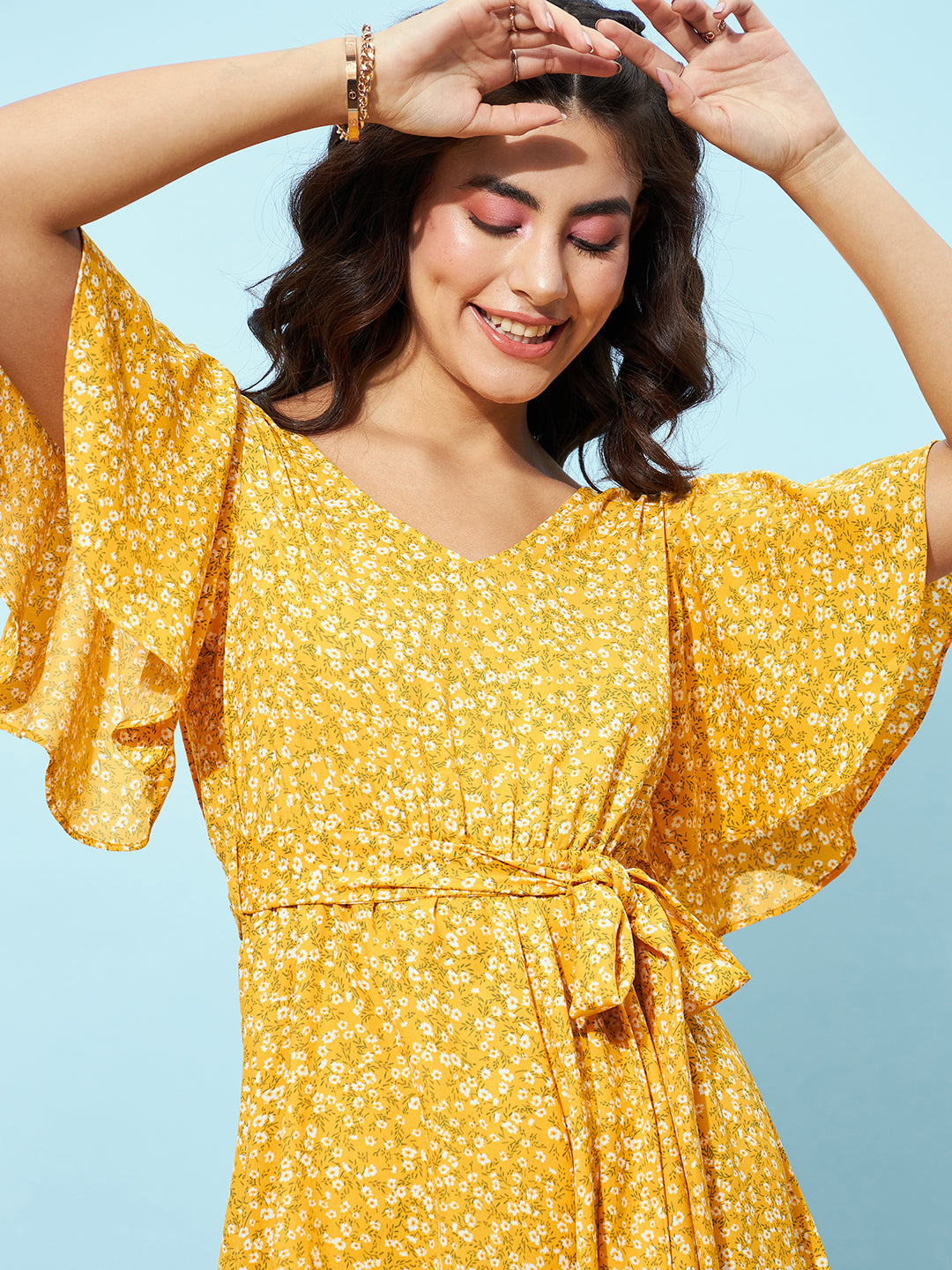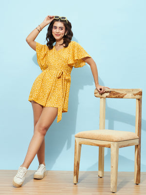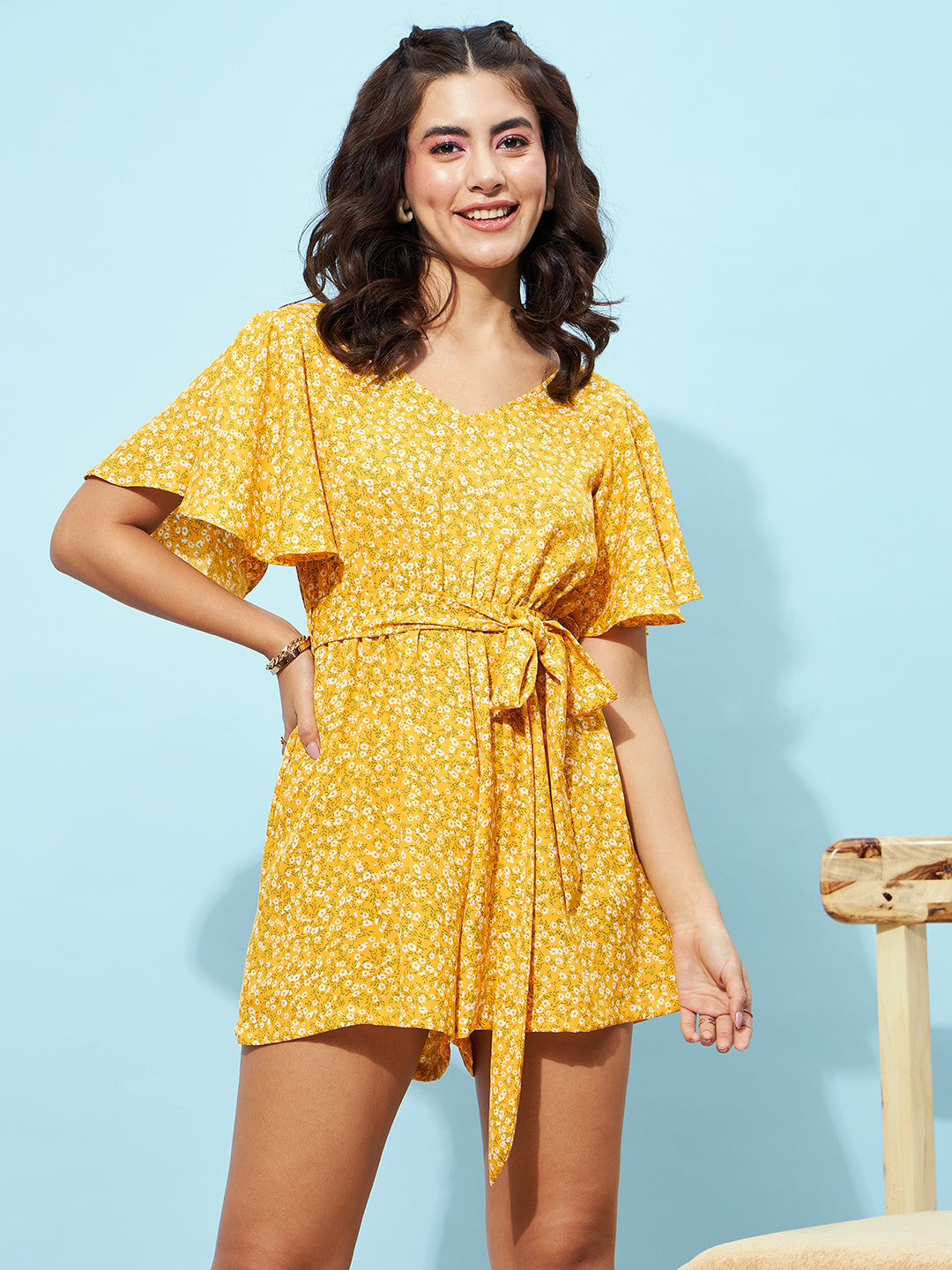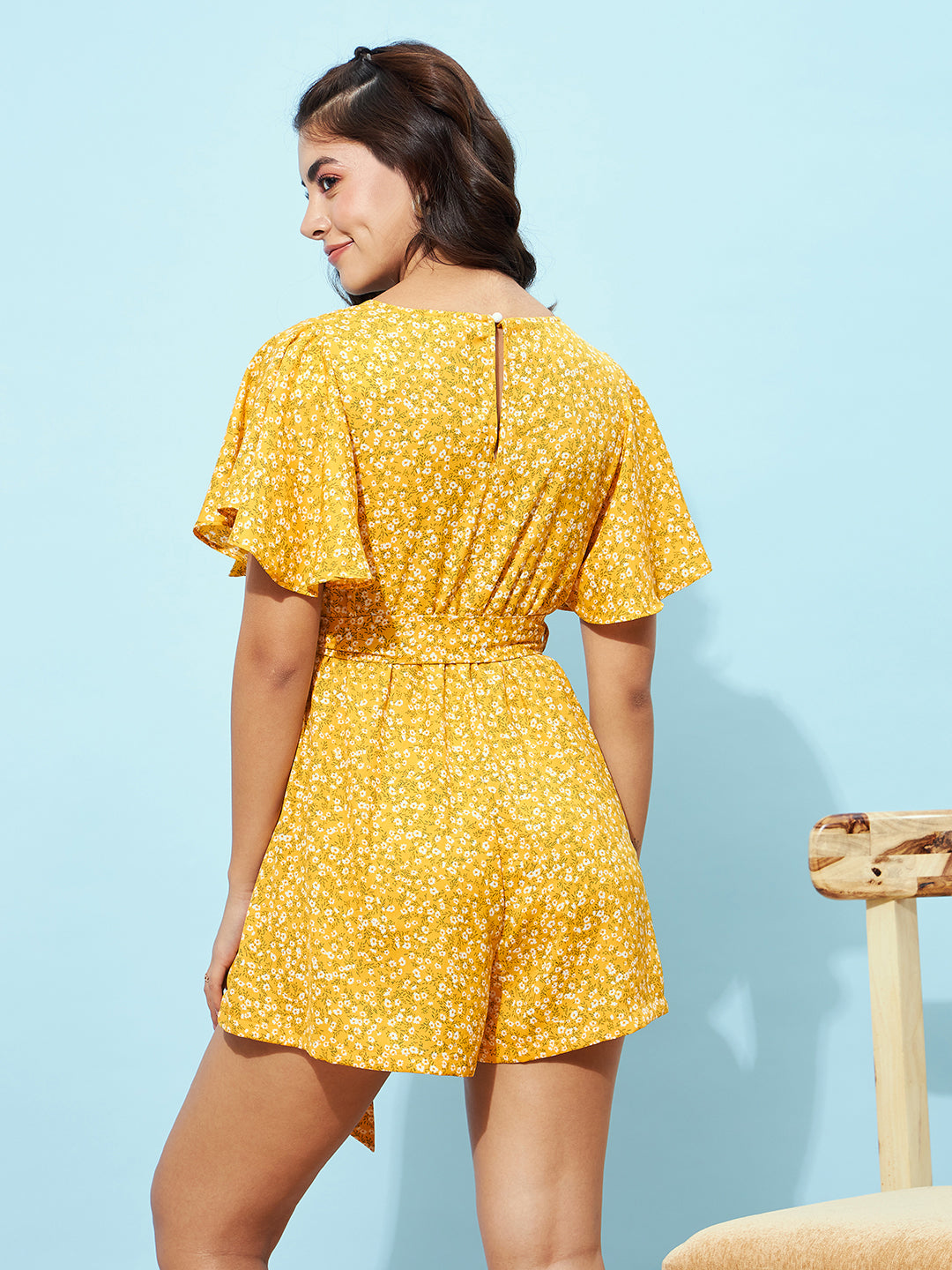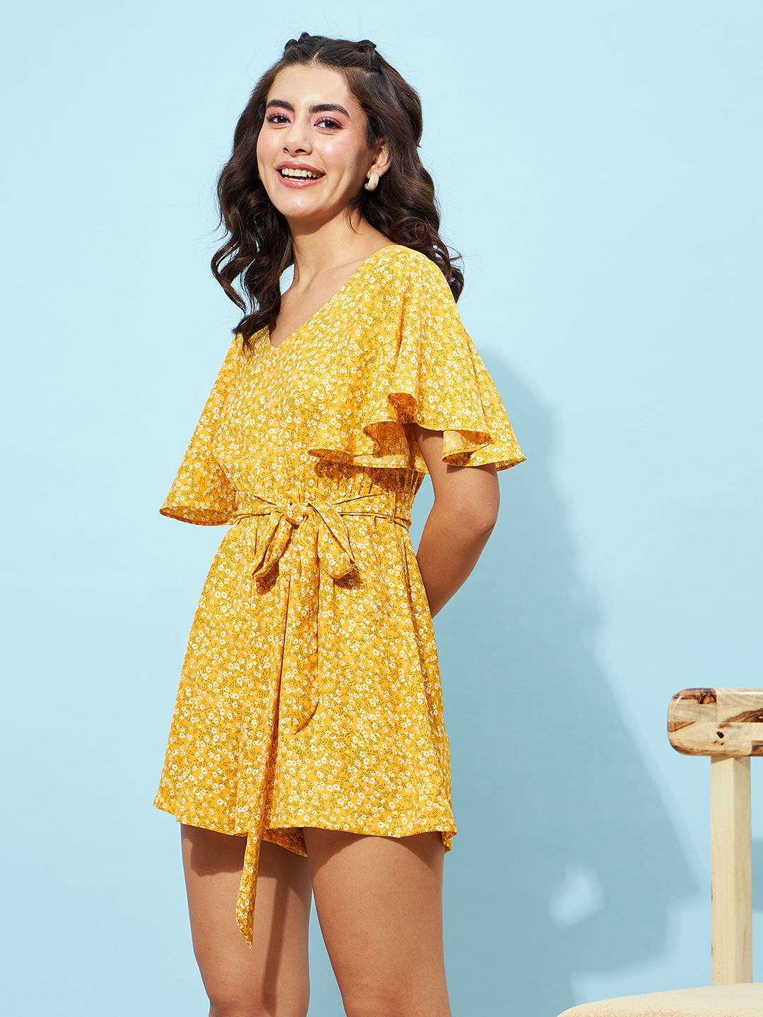Berrylush Women Yellow & White Floral Printed V-Neck Tie-Up Waist Keyhole Back Ruffled Mini Jumpsuit