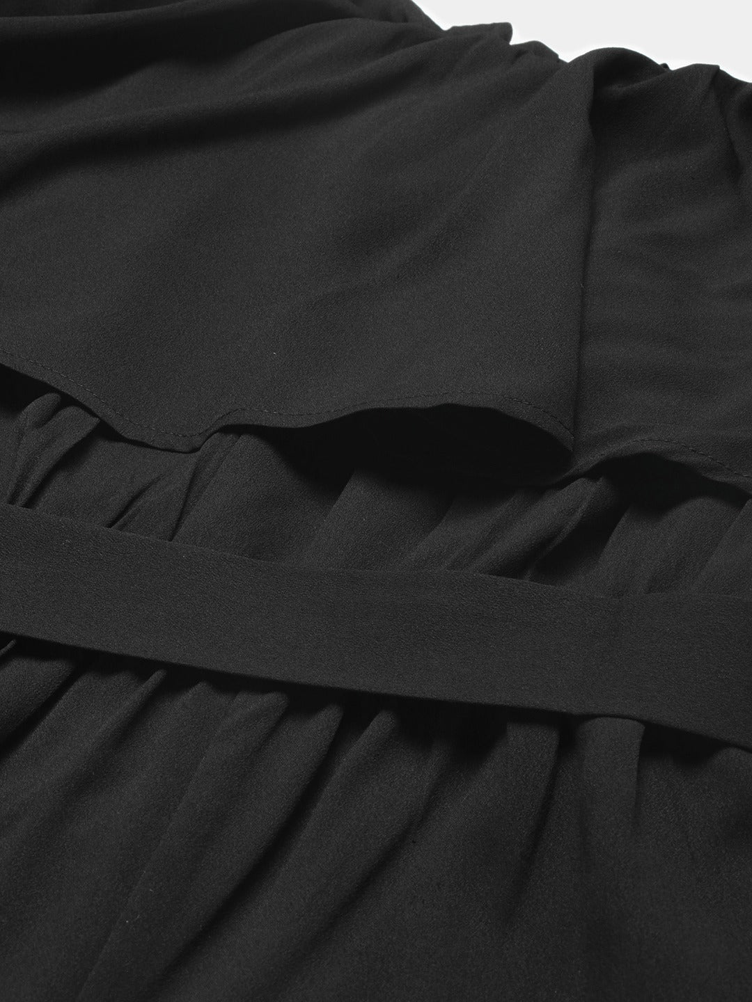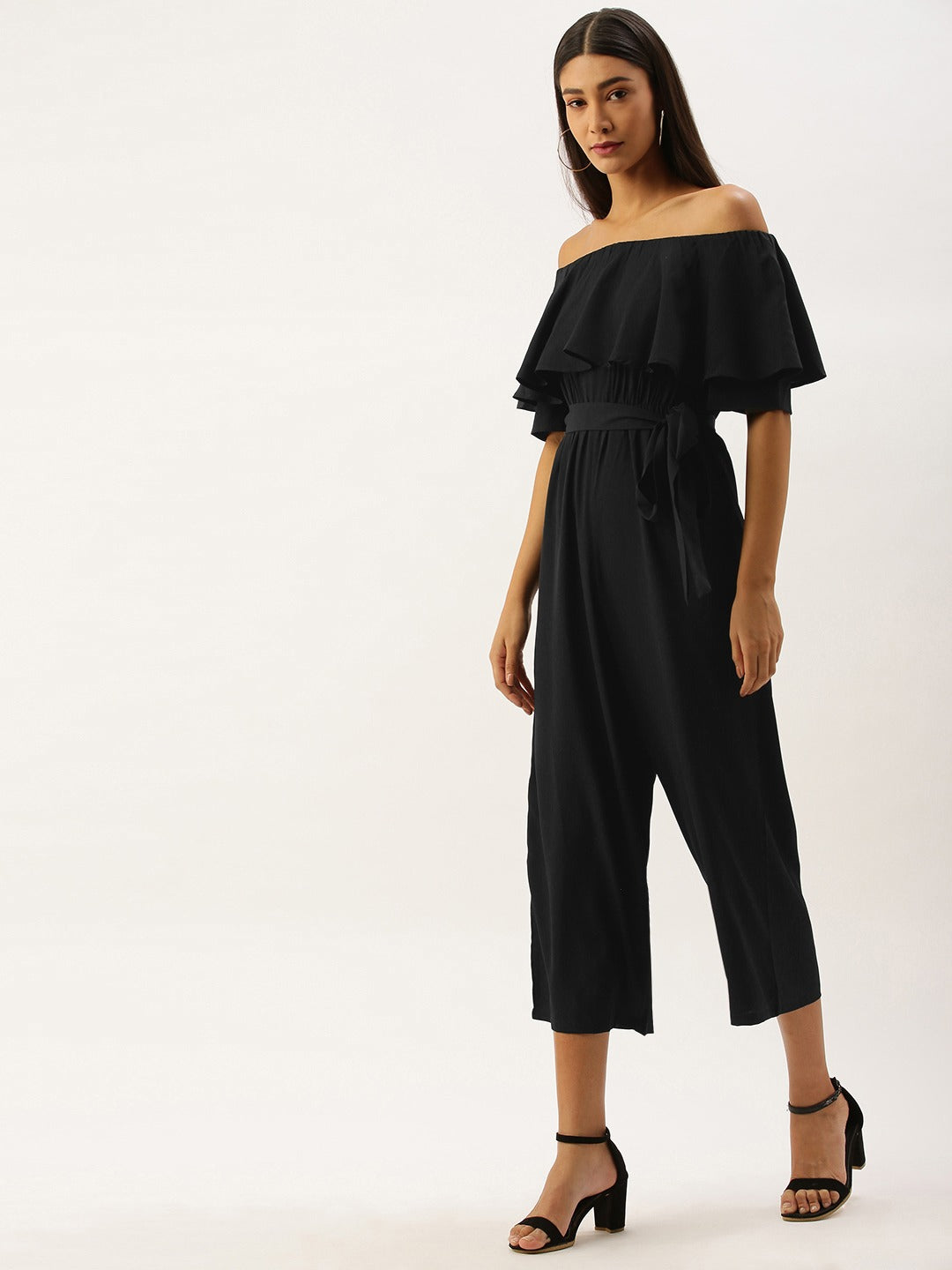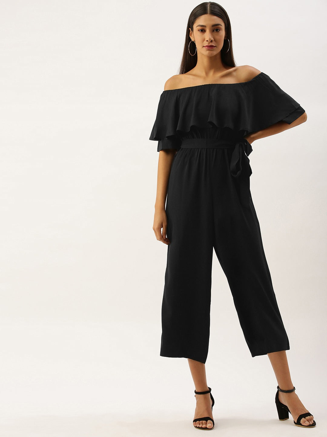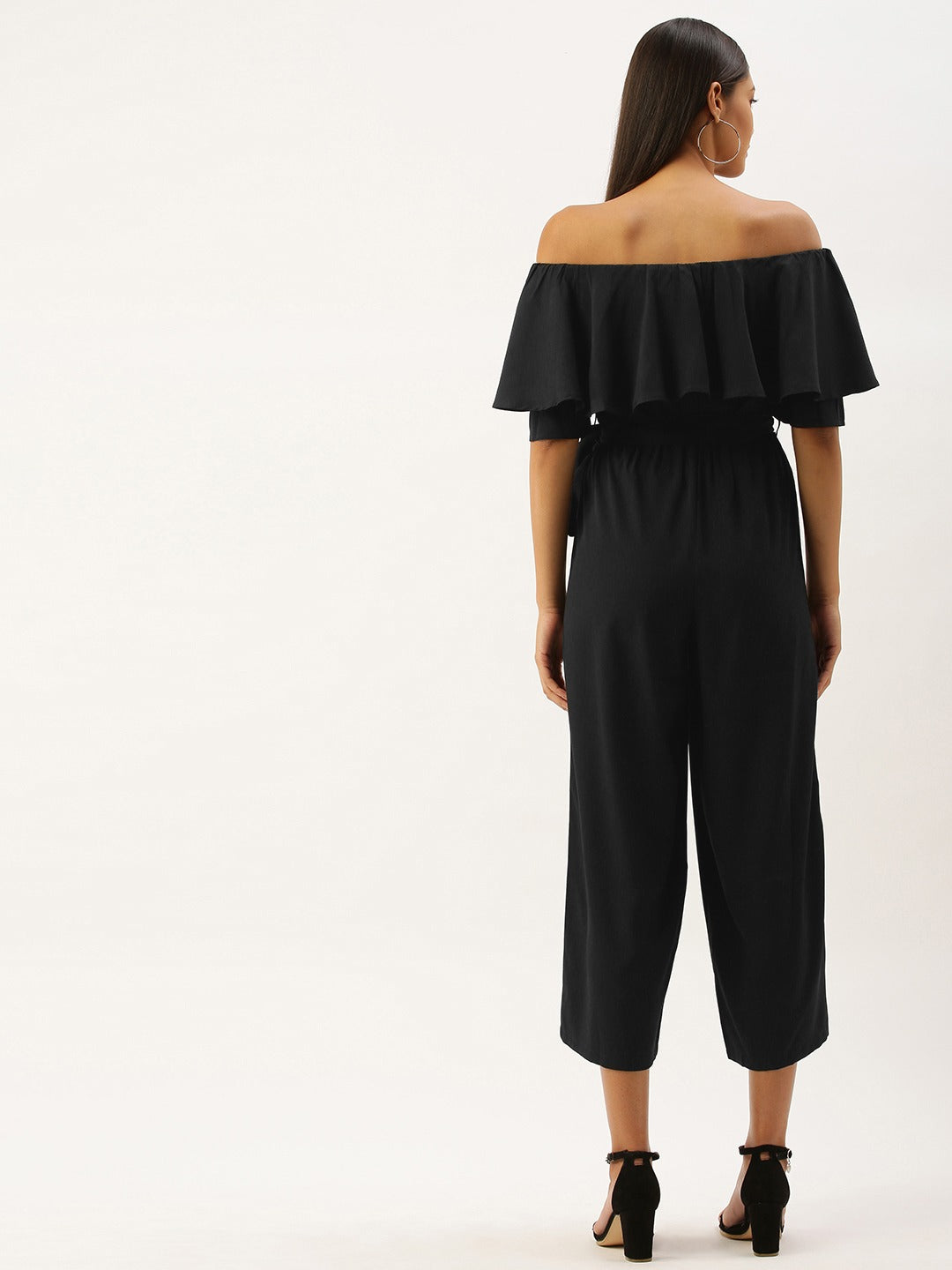 The only color that has never disappointed a lady is the color black and adding the iconic Berrylush Solid Black Off Shoulder Culotte Jumpsuit to your wardrobe is a smart choice. Though black color is considered outrageous, this time your attitude becomes more impactful with the ruffles present in this outfit. Alluring off-the-shoulder neckline brings out your strong persona and sleek division with the fascinating inclusion of the waistline tie-up knot in fact makes your figure more flattering. Long flare legs with super fine cuts perfectly give you confident steps. Style this charming black-colored jumpsuit from Berrylush with peep-toe heels and a sassy silver embellished sling bag for a perfect look.