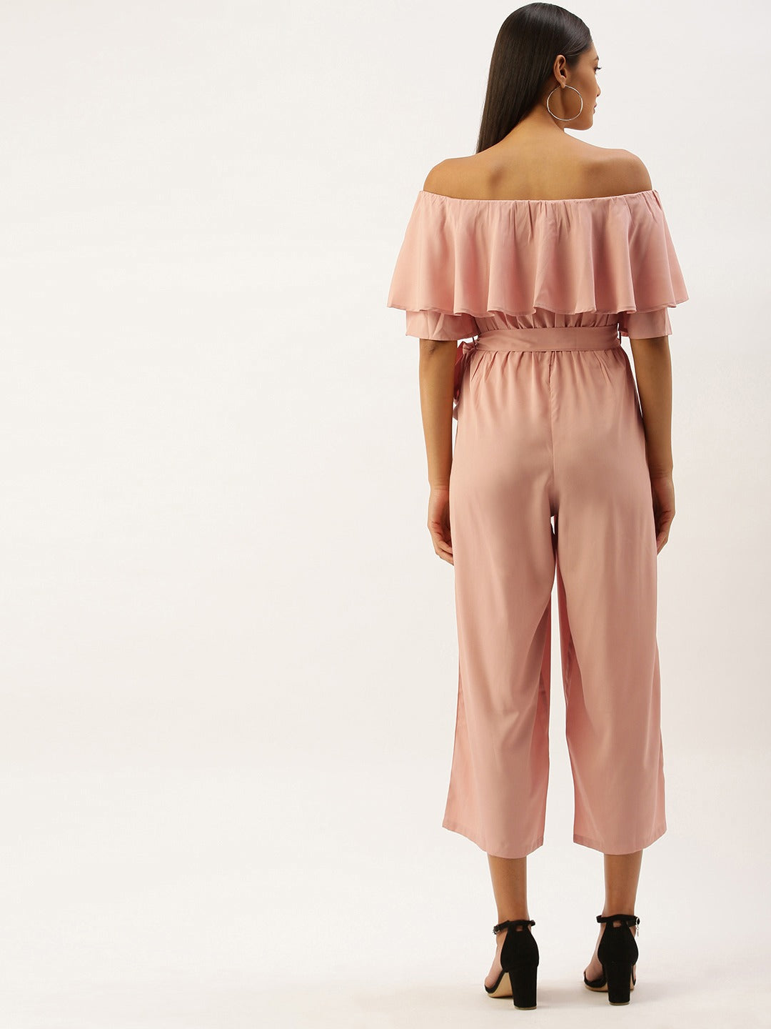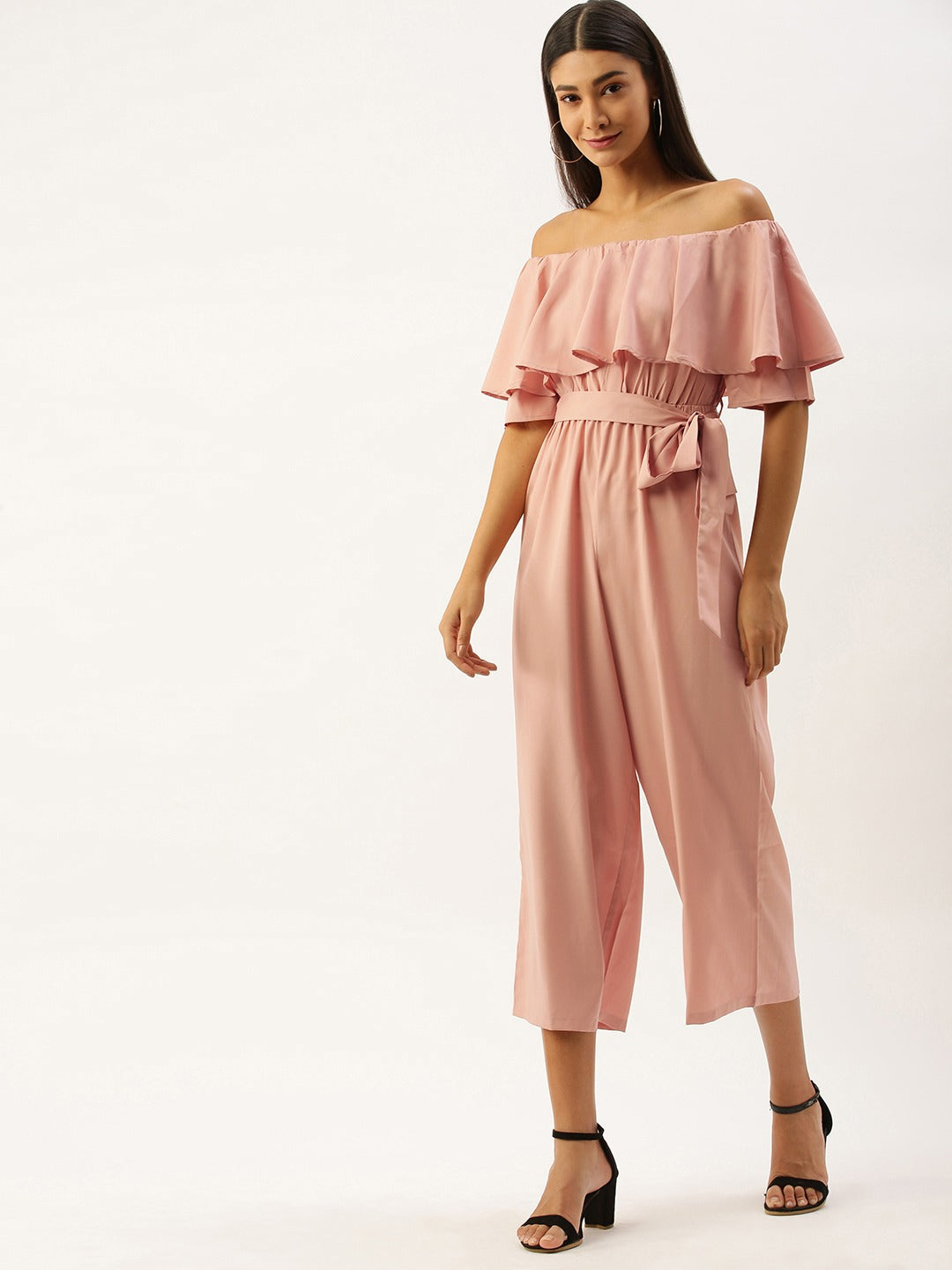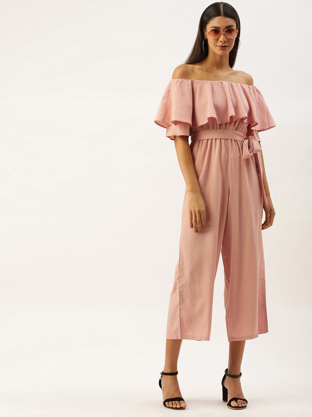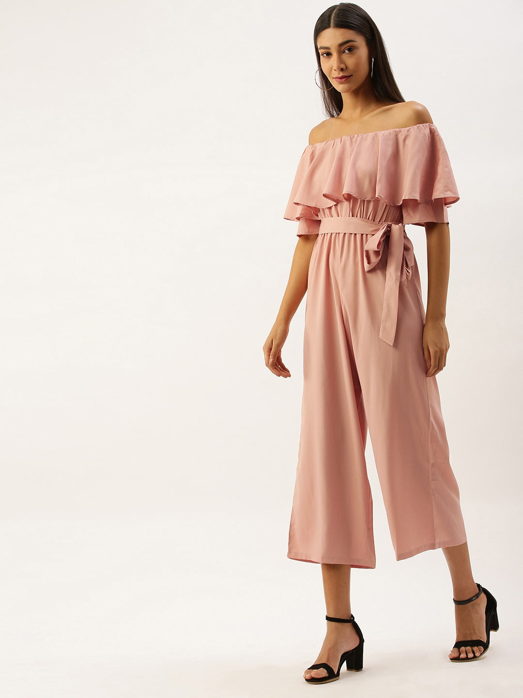 Imagine your appearance like a charming diva after trying this lovely Berrylush Pink Solid Off Shoulder Jumpsuit. Stylize with the season's most loved feminine charm present in this off-the-shoulder ruffle playful jumpsuit. Cuddle the cute design done amidst the flowy hemline in this western wear. Long flare legs with super fine cuts perfectly adore the beauty and the banded waistline with the fancy knot is another element that speaks about your trimmed figure. Walk with irresistible grace as you are going to escape the ordinary with the fabulous Bardot-patterned design that gives a bounce over the bust area with ritzy ruffles. Fill magic by draping this magnificent jumpsuit from Berrylush with peep-toe heels and a sassy embellished sling bag.