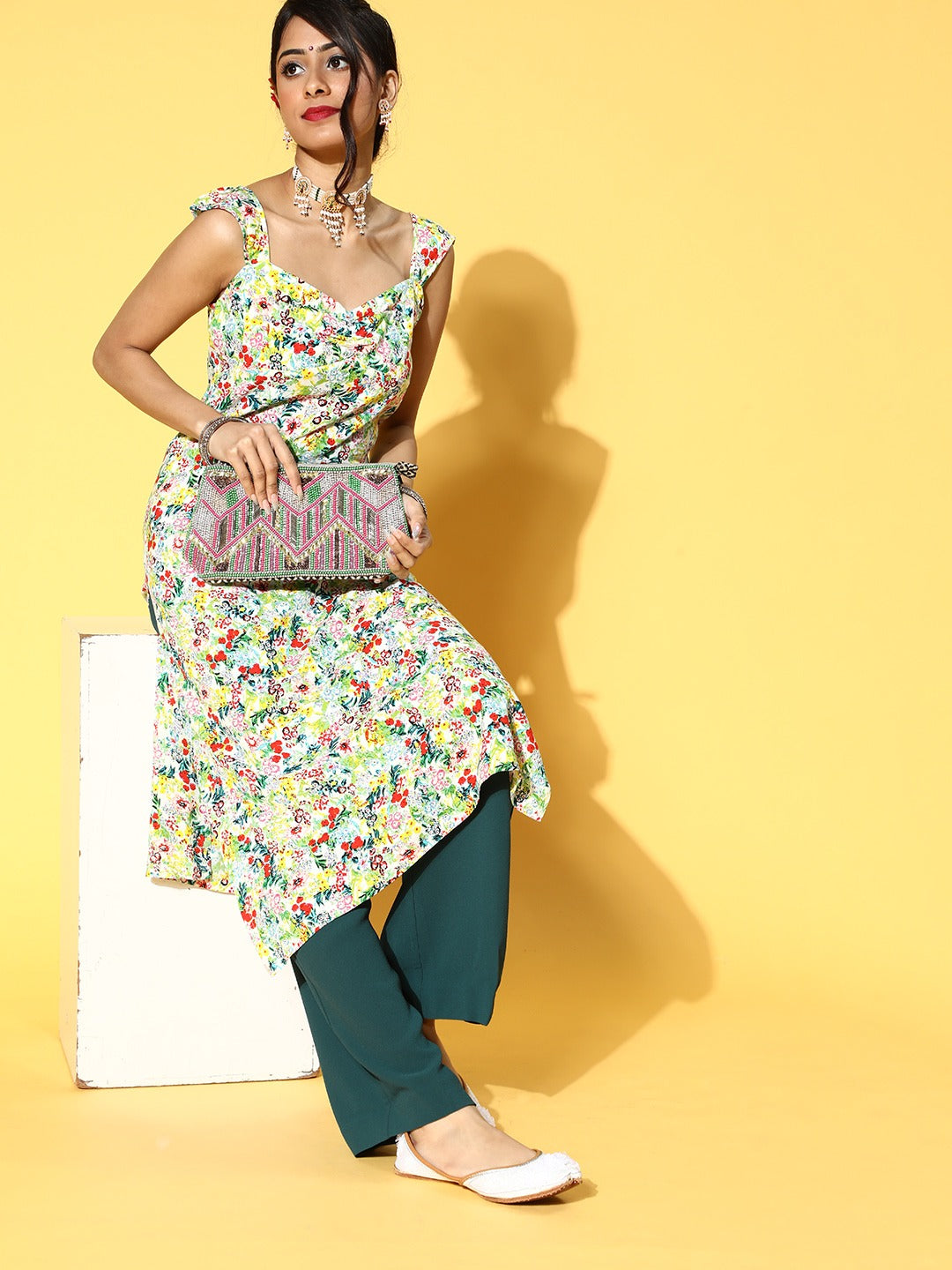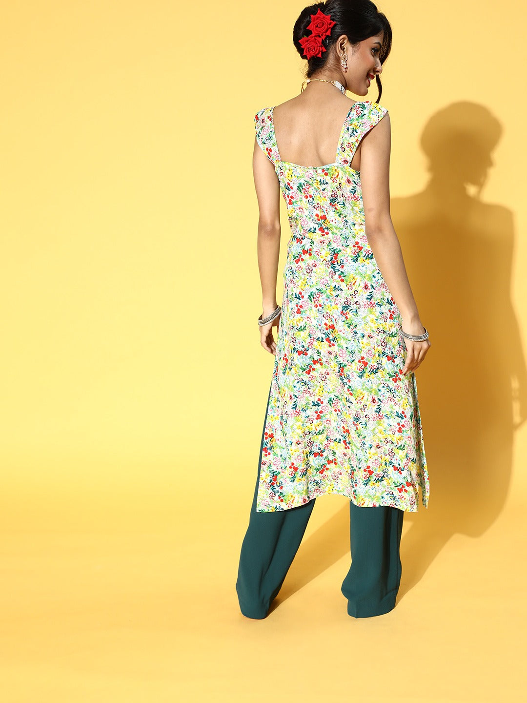 Berrylush Women White & Green Floral Printed Sweetheart Neck Side Slited Midi Kurta