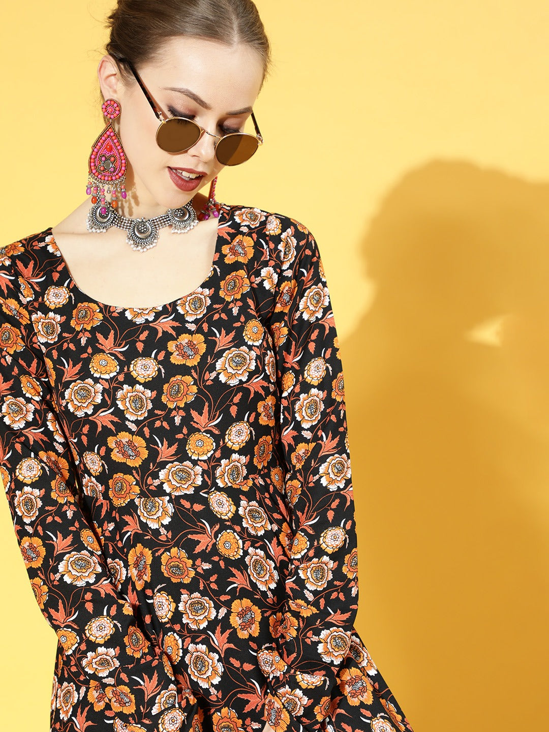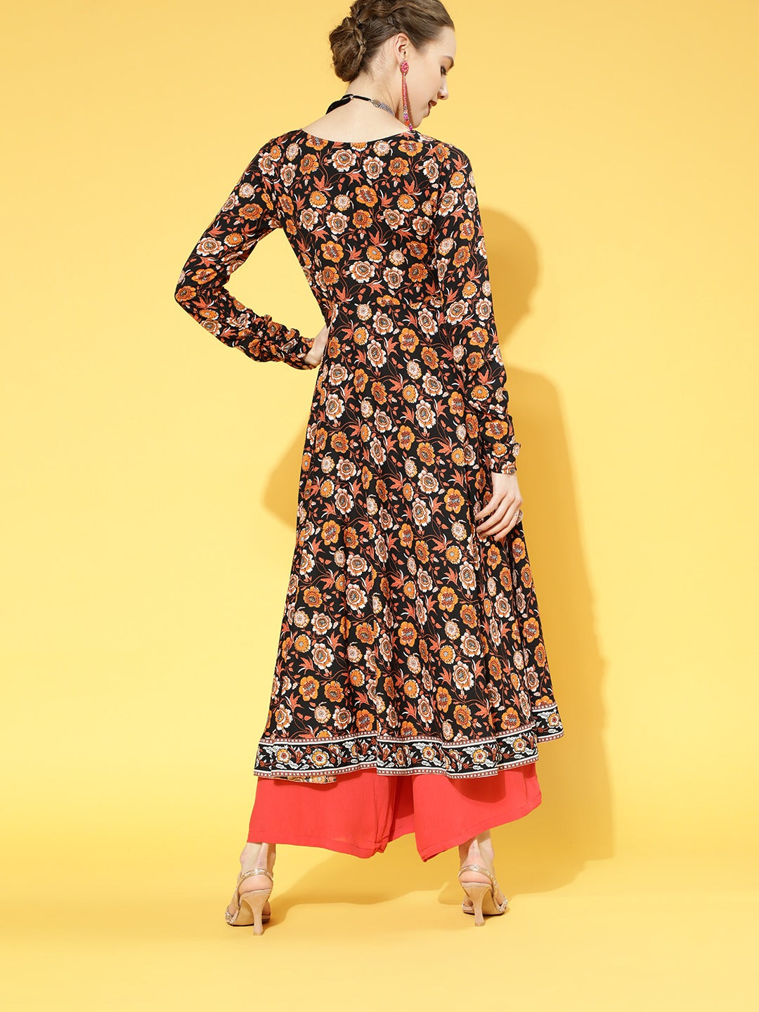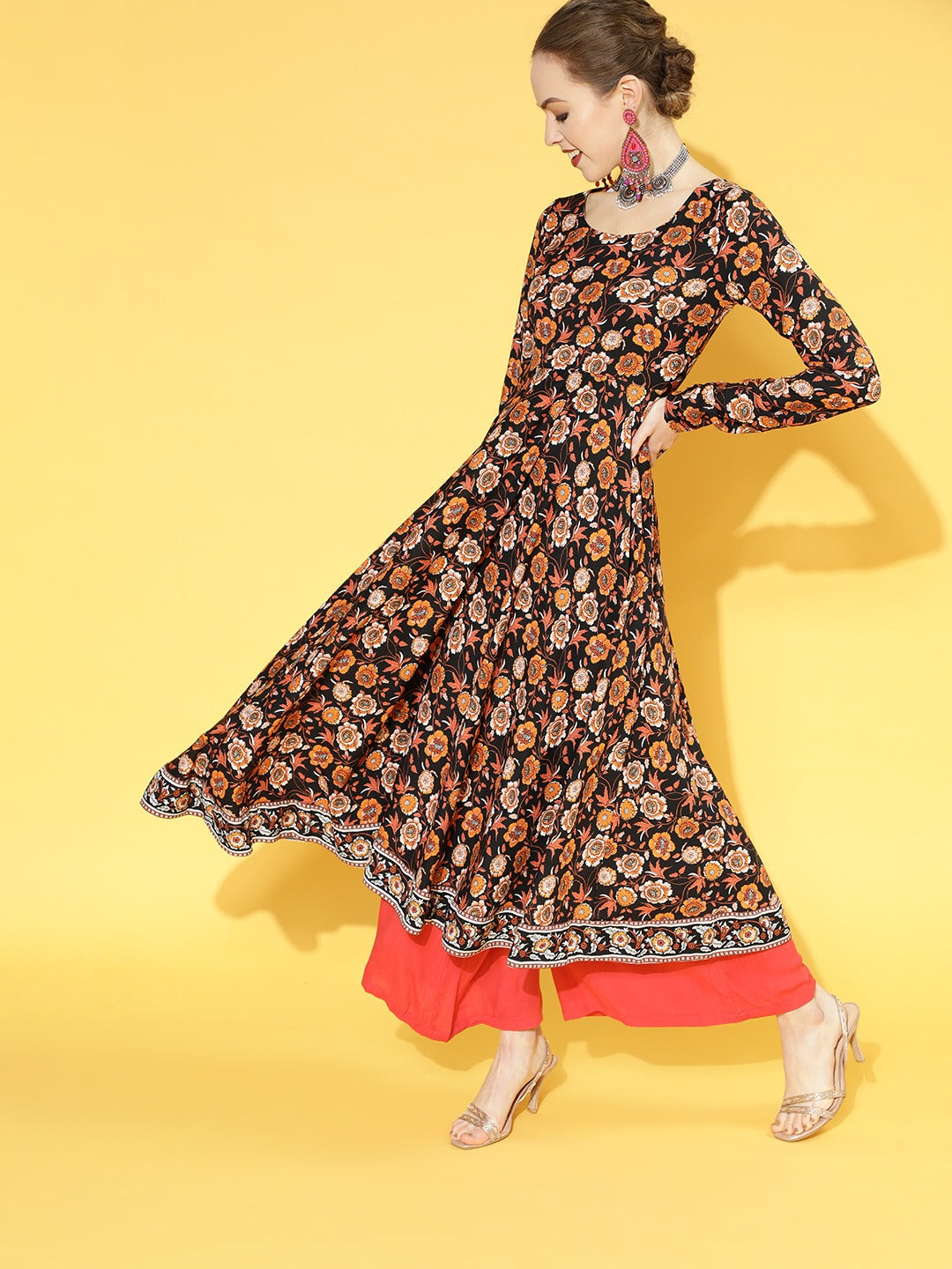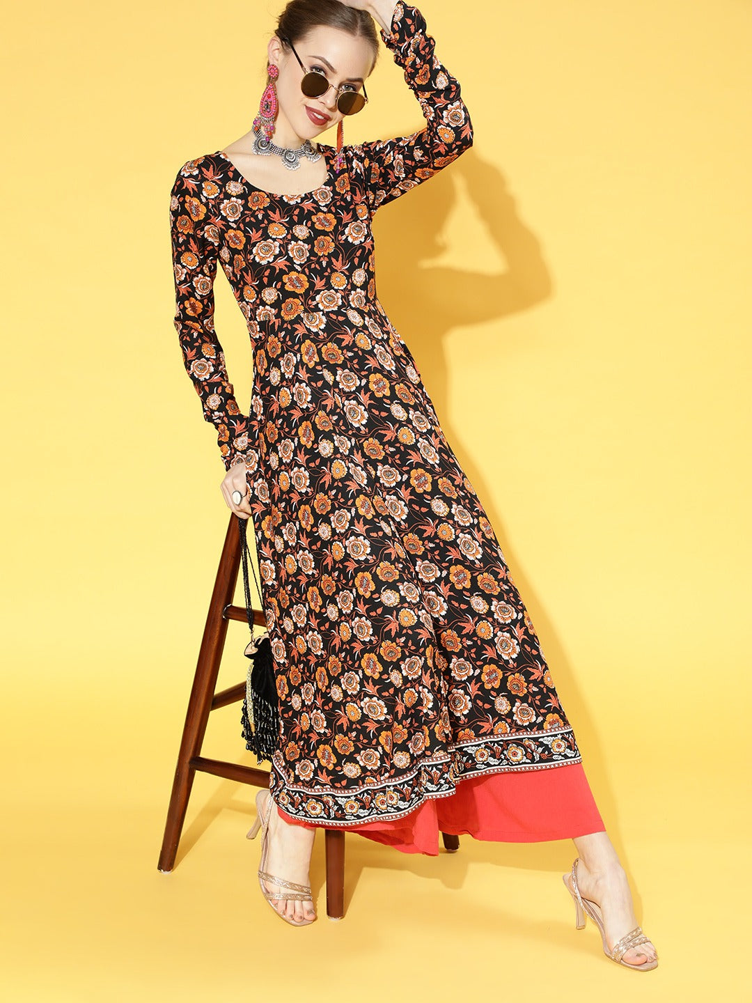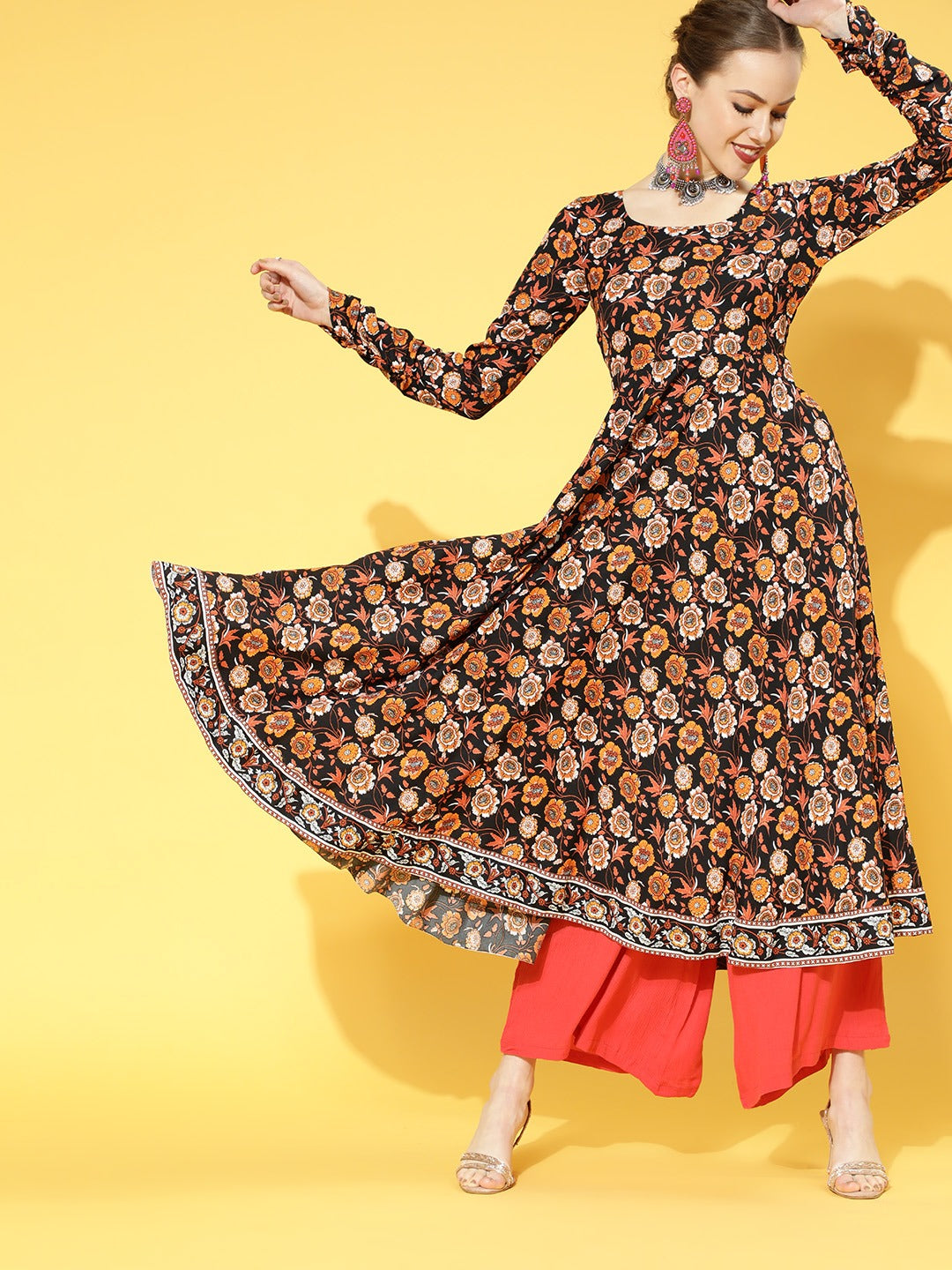 Berrylush Women Black & Orange Ethnic Motifs Printed Round Neck Flared Calf Length Anarkali Kurta