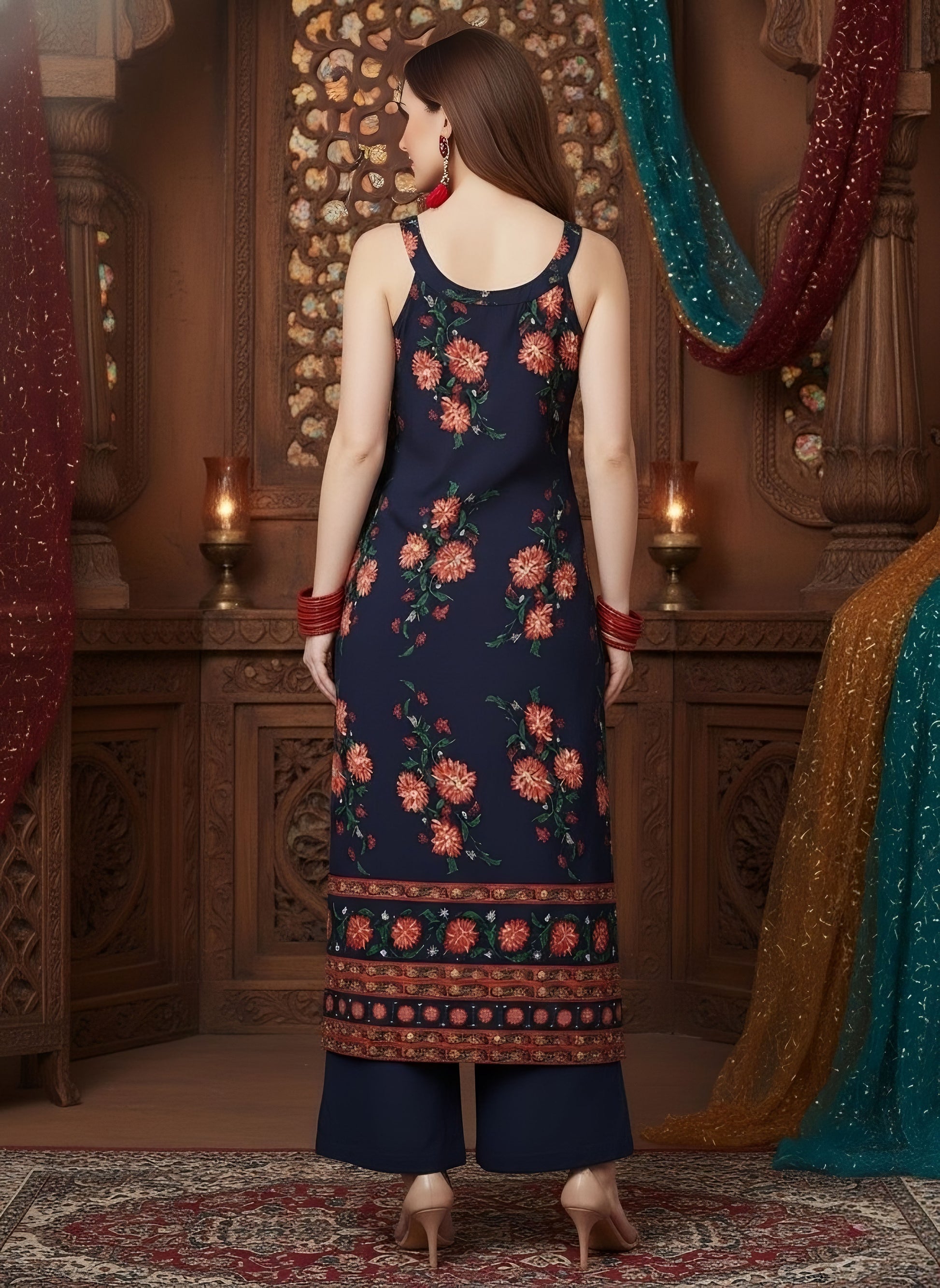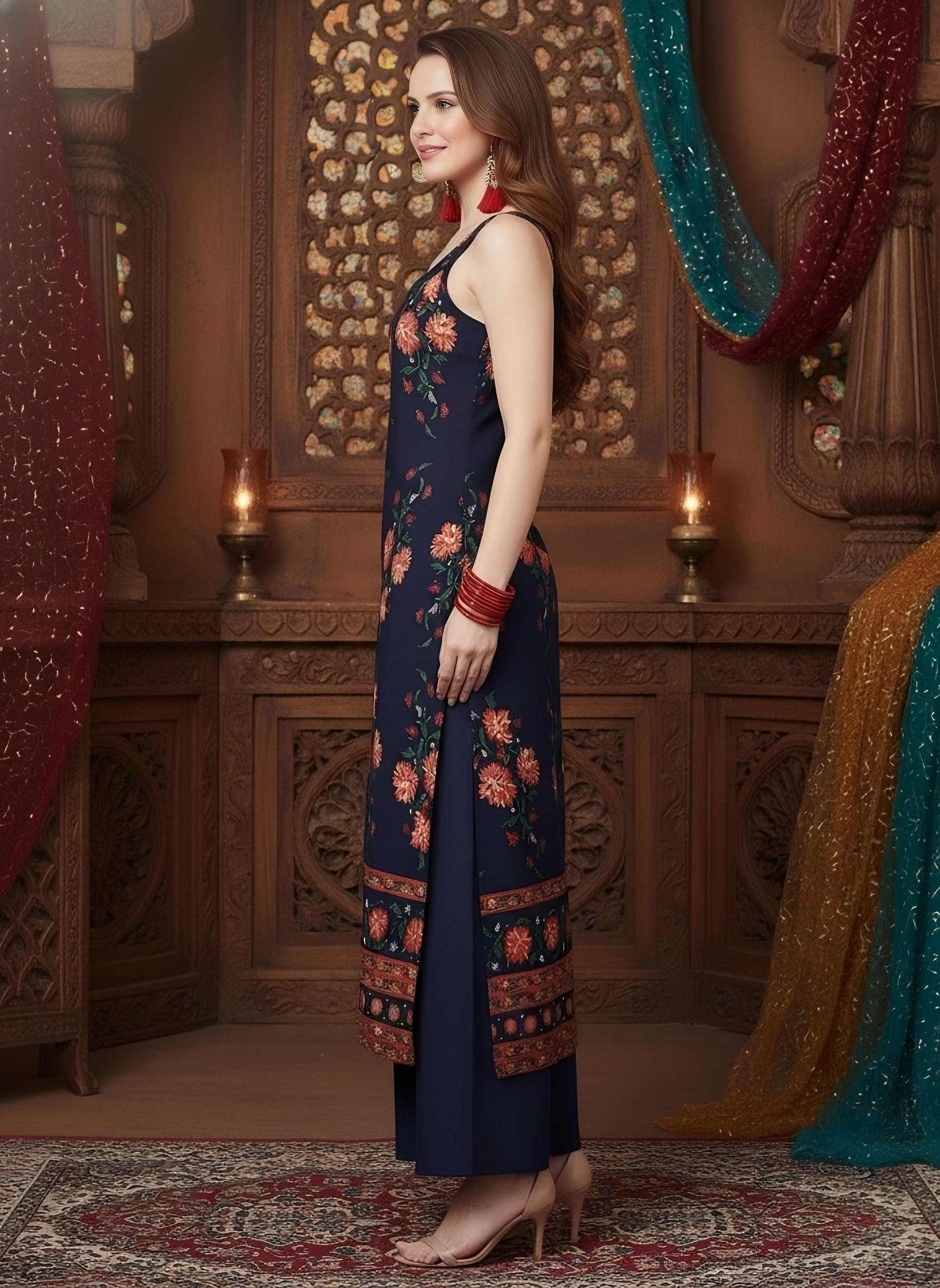Include a classy and fascinating essence to your ethnic wear collection by bringing home this charming Navy Blue & Orange Floral Printed Scoop-Neck Side-Slit Straight Kurta from Berrylush. You will find this kurta astonishing and elegant as its straight shape give stunning fit and structure to your body while the sleeveless attribute offers consistent free movements of your arms. The scoop neck design of the kurta gives classic and dignified appeal to your beautiful neckline and the amazing amalgam of navy-blue shade with orange floral print creates a creative and mysterious vibe. Pair this captivating straight kurta with an orange shade of churidar leggings and your favourite pair of flats to get a classic appearance.