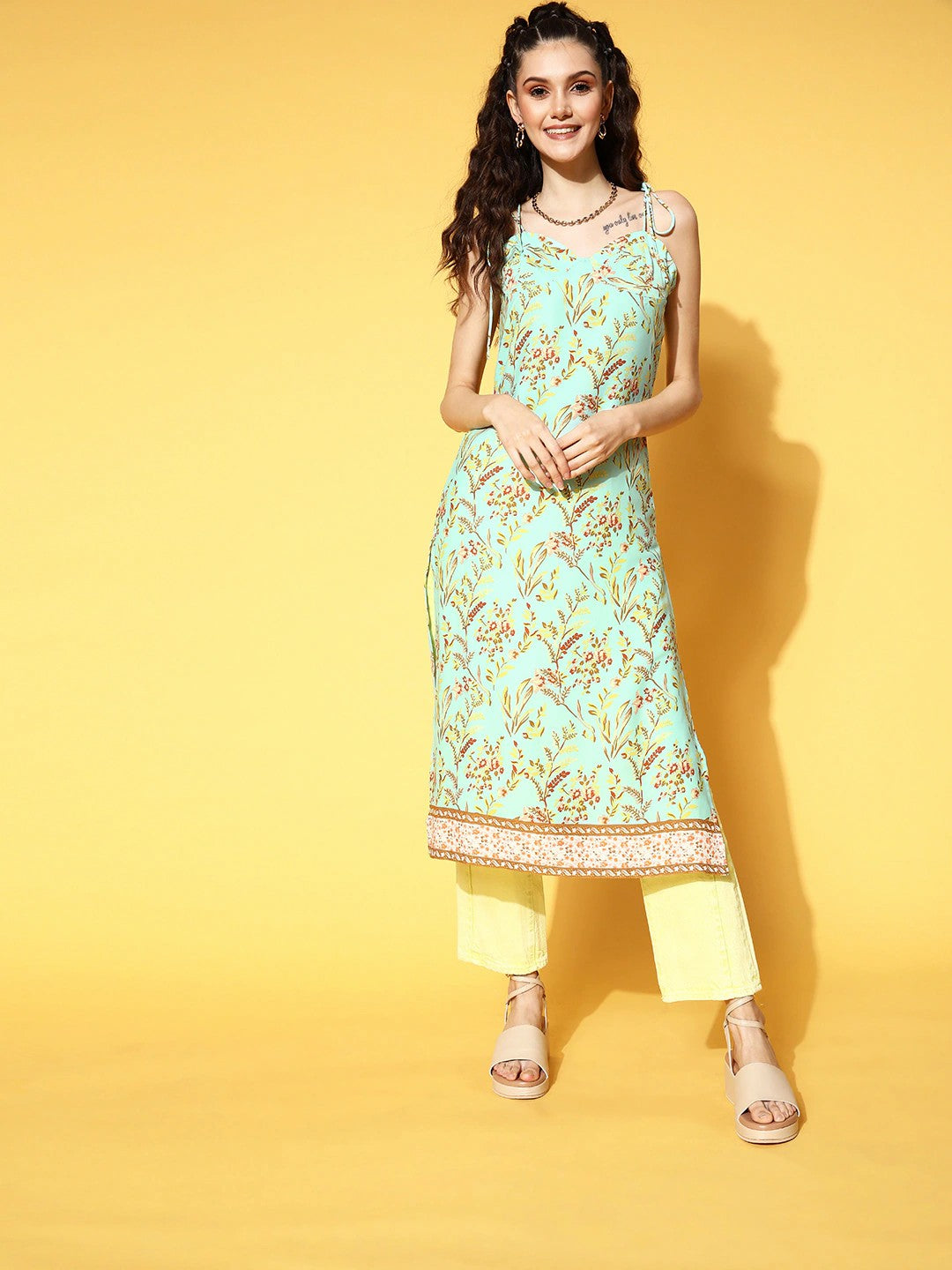 Berrylush Women Sea Green Floral Printed Sweetheart Neck Tie-Up Strap Straight Midi Kurta