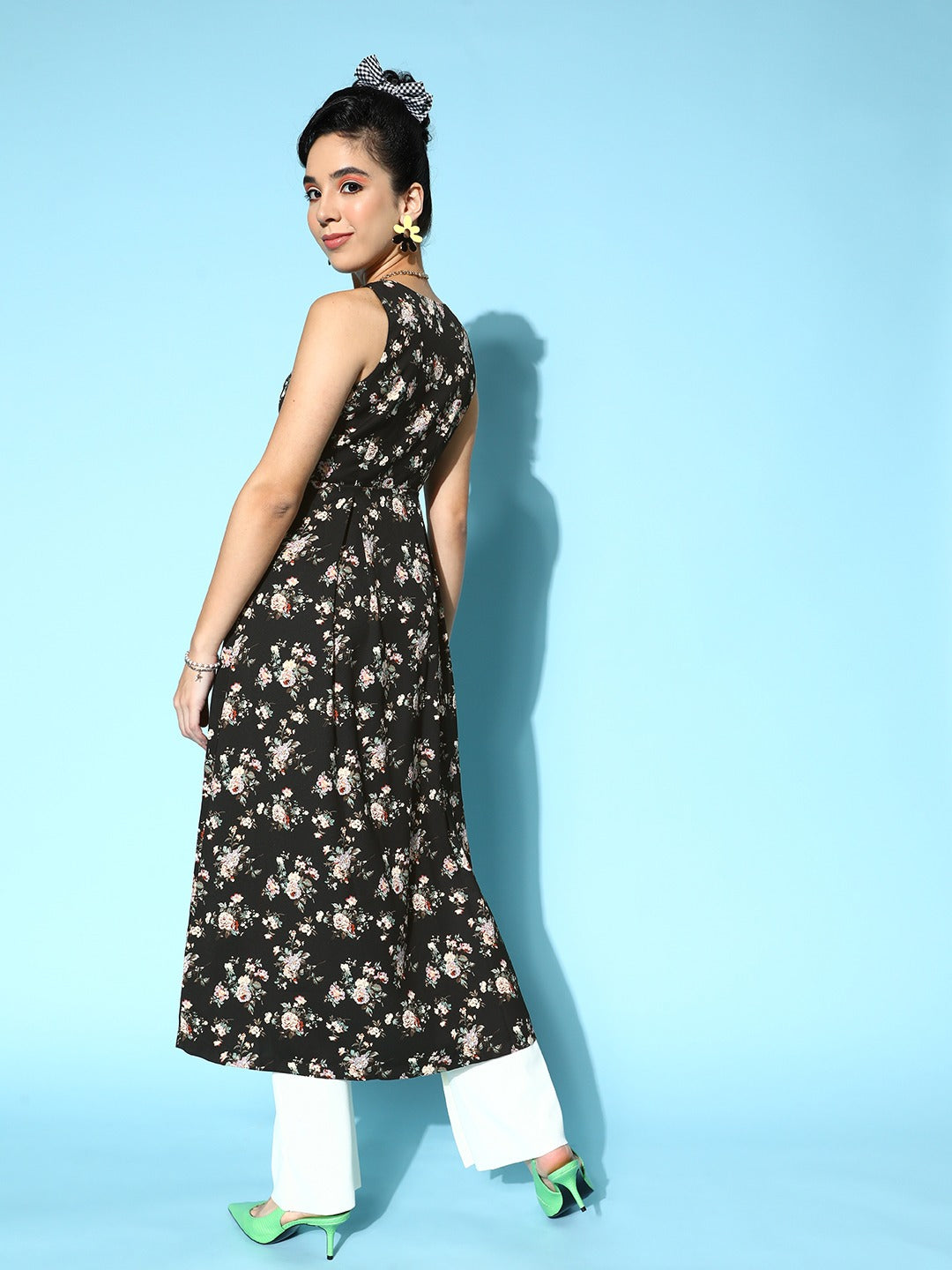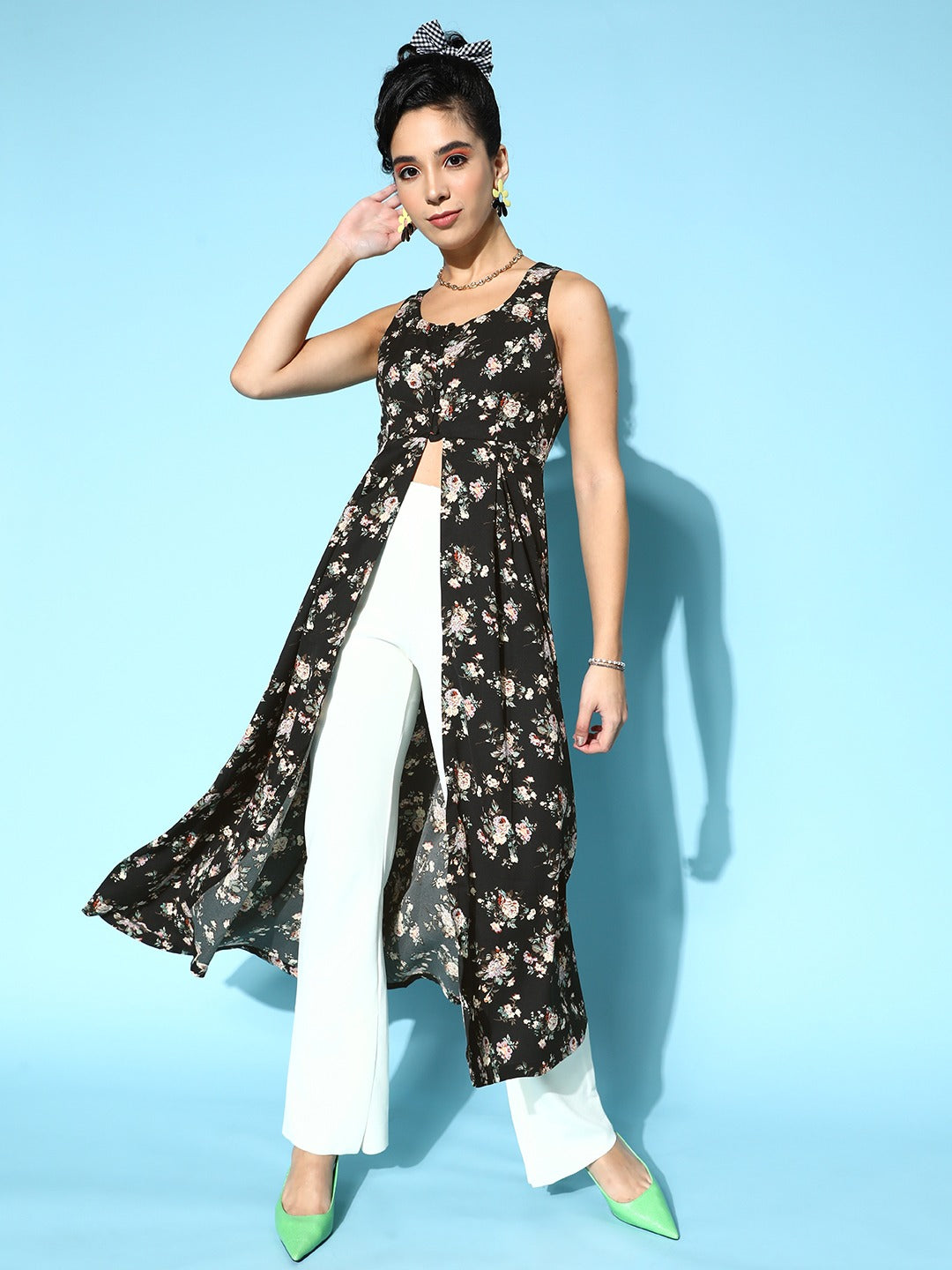 Thinking of a refreshing take for your fusion selection, then opt for this charming Black and White Floral Printed Round Neck A-Line Calf Length Kurta from the exclusive kurta collection launched by Berrylush. Milled from lightweight polyester material for all-day comfort with uninterrupted breathability and excellent moisture-wicking attribute. Showing off an a-line shape that gives this kurta a figure-hugging silhouette to outshine your feminine figure with a flattering hem. Moreover, the sleeveless design adjoins a dose of versatility to this kurta with an alluring appeal to your beautiful arms. Create a fabulous look for your college feast by pairing this kurta with white parallel pants, contrasting heels, ethnic silver earrings, and a chic handbag.