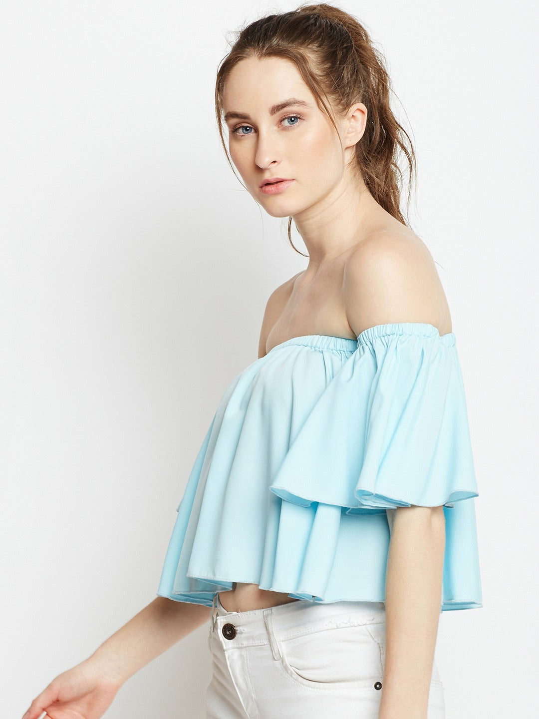 Berrylush Women Solid Blue Off-Shoulder Neck Flared Sleeves Ruffled Bardot Crop Top