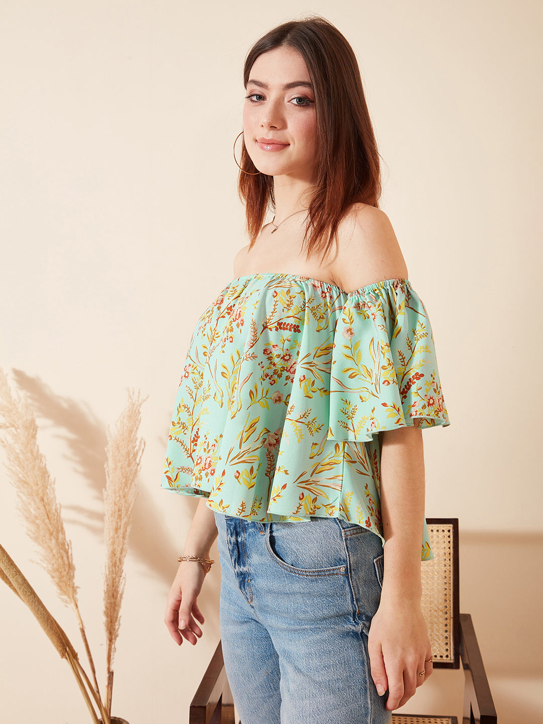 Introducing the enchanting Green & Brown Floral Printed Off-Shoulder Neck Bell Sleeve Pleated Crop Blouson Top from Berrylush. Crafted with exquisite attention to detail, this top is a masterpiece of smart casual wear. The luxurious polyester fabric weaves comfort and style into every thread, while its off-shoulder neckline adds a touch of allure. Short bell sleeves flutter with grace, and the pleated surface styling brings texture to its crop blouson silhouette. Emblazoned with vibrant green and brown florals, it's opaque yet daringly feminine—a perfect blend for those who love to make a statement in their day-to-day ensemble.