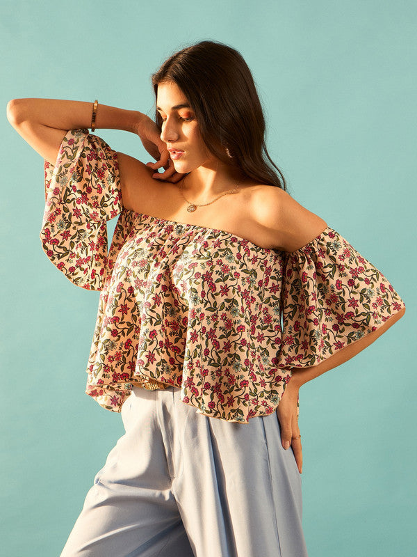 Berrylush Women Pink & Green Floral Printed Off-Shoulder Neck Flared Sleeves Pleated Regular Bardot Top