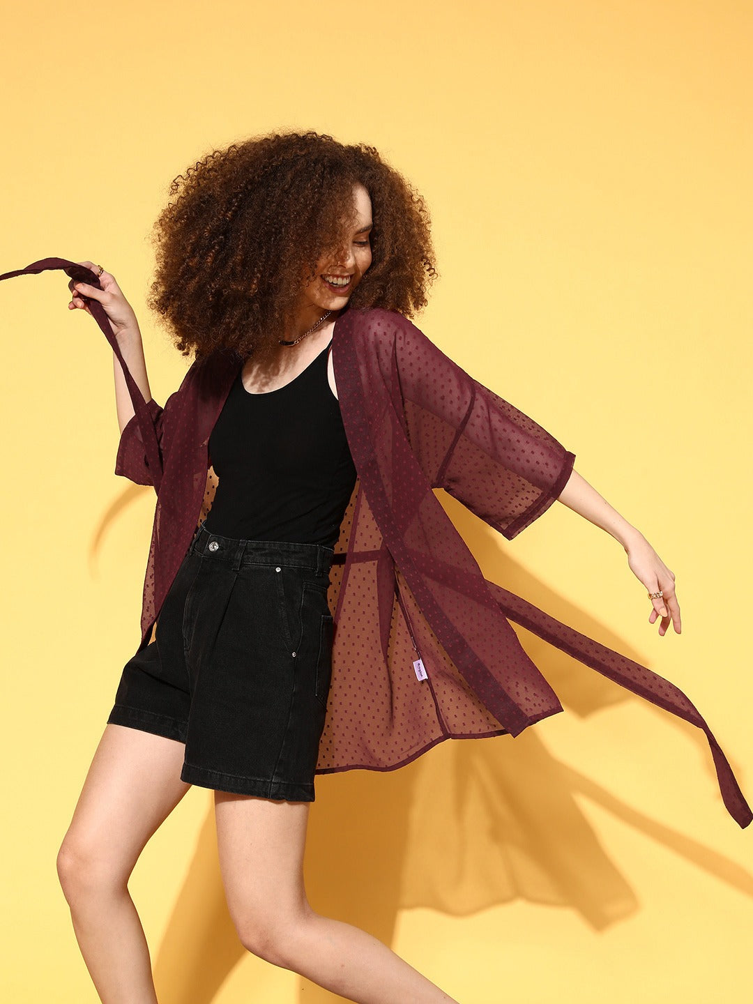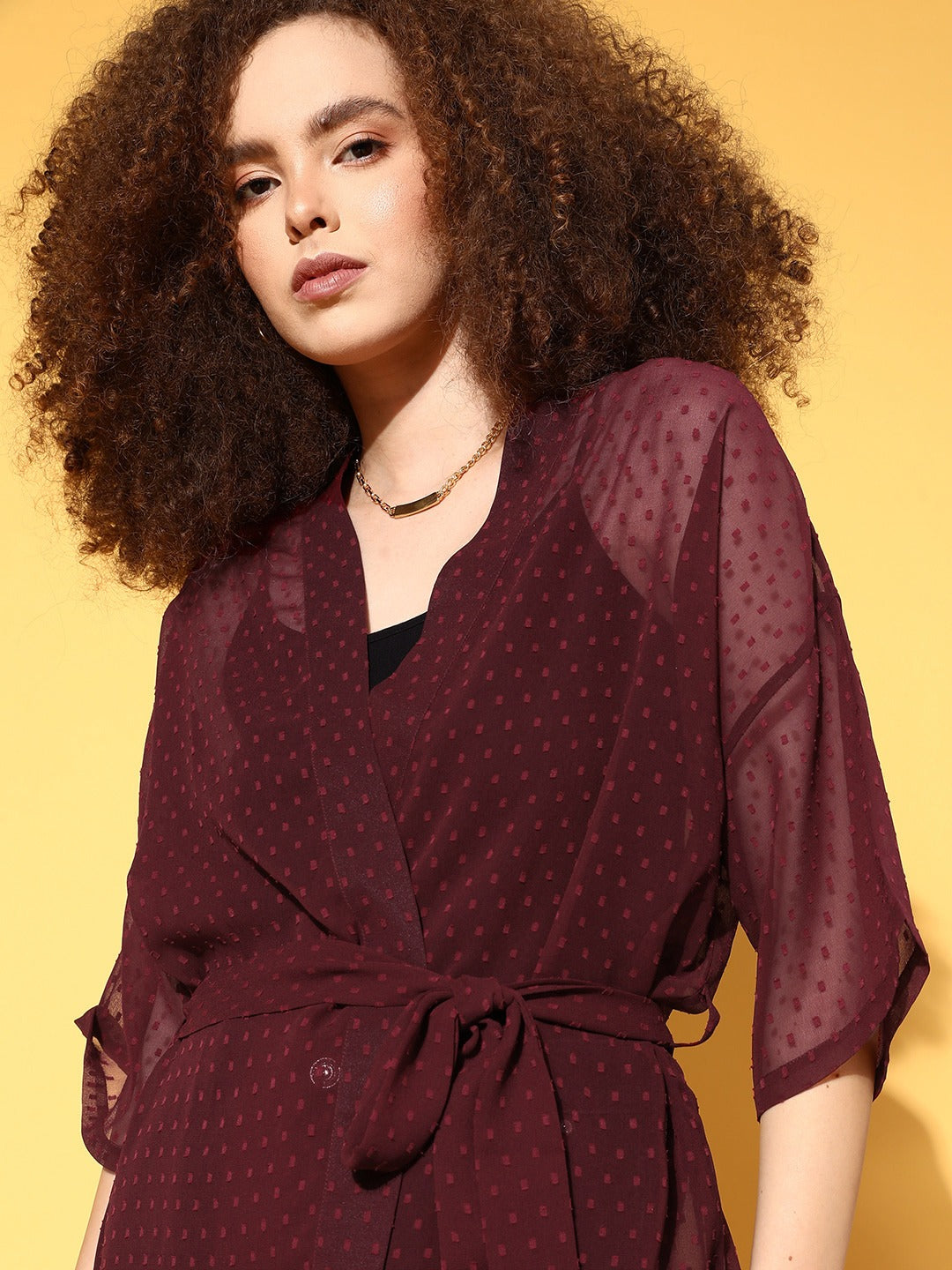 Berrylush Women Maroon Self-Design Pattern Open Front Waist Tie-Up Georgette Regular Shrug