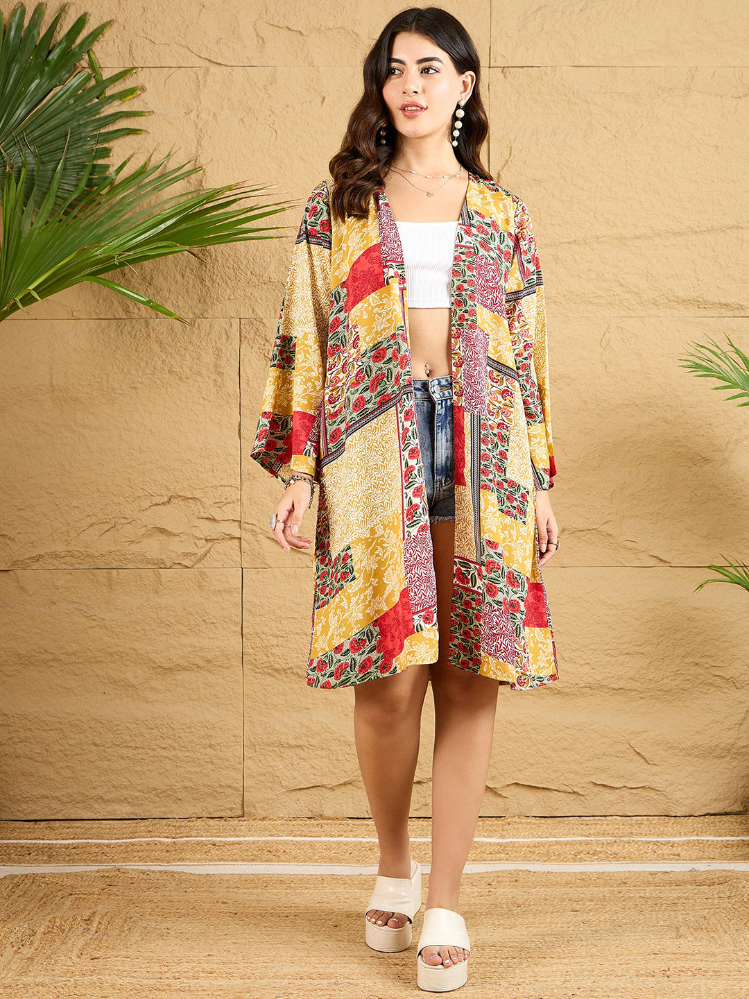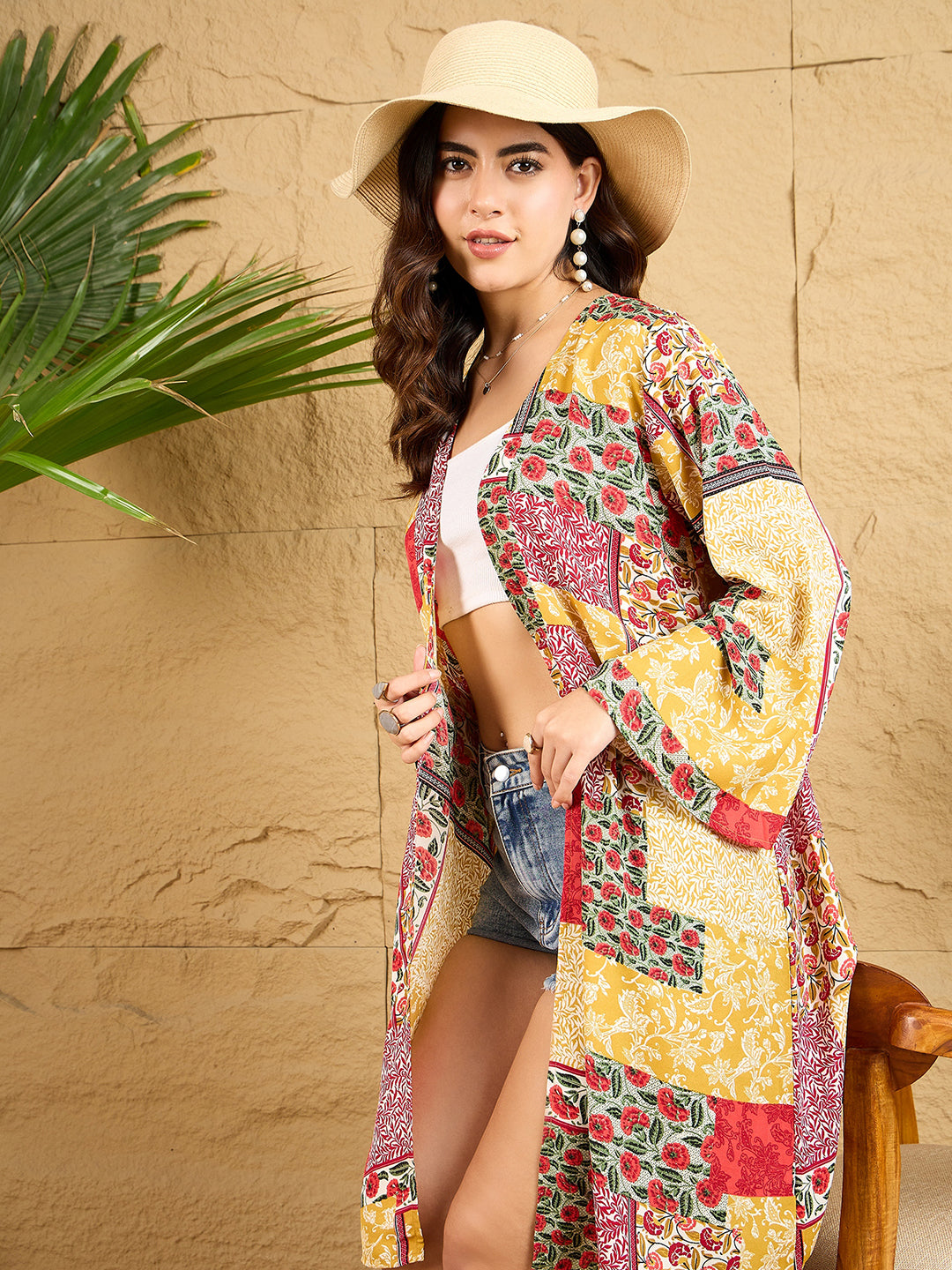 Berrylush Women Red & Yellow Floral Printed V-Neck Open-Front Straight Hem Longline Shrug