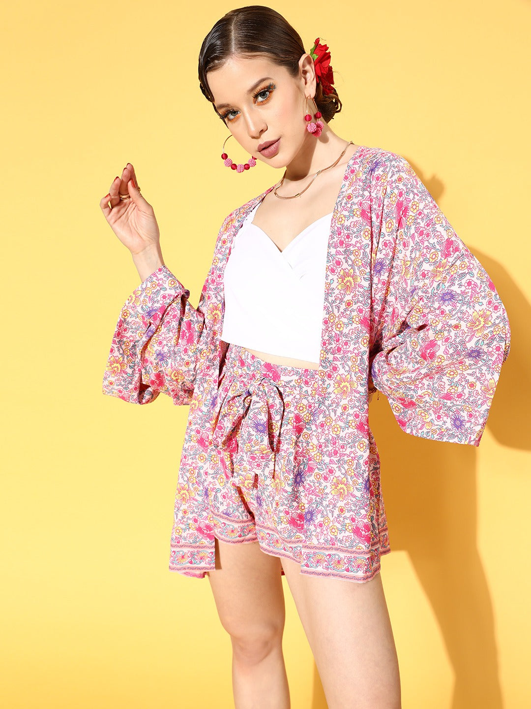Berrylush Women Pink & White Floral Printed Open-Front Straight Hem Regular Shrug