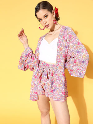 Pick up style statements that last a lifetime for your capsule closet just like this pretty Pink & White Floral Printed Open-Front Straight Hem Regular Shrug presented by Berrylush. Punctuated from the finest polyester fabric to assemble a lightweight creation and also to provide this shrug with a wrinkle-resistance ability. Flaunting is an amusing combination of pink and white floral print that presents a visualization of full bloom along with a cheerful vibe that brightens up your gloomy day. That's not all, this shrug is designed with a straight hemline that assembles a sophisticated styling element to lend you a chic look. Partner up this bohemian shrug with similar printed shorts, a white crop top, cute earrings, and an adorable pink bag to get a fabulous final appearance.