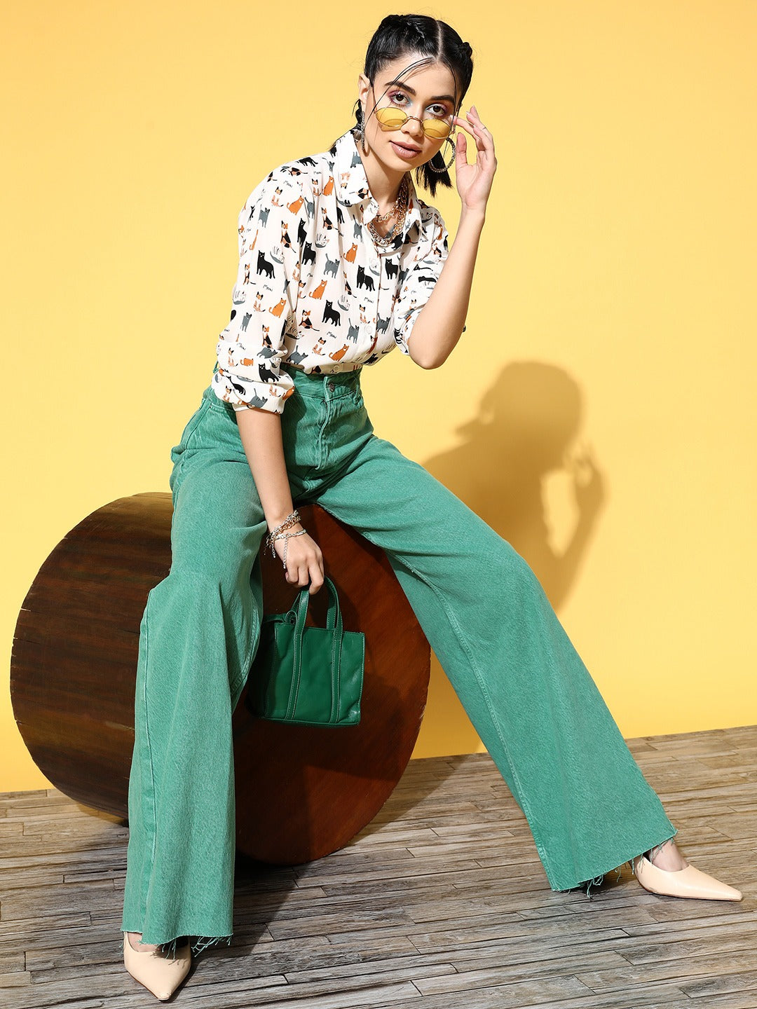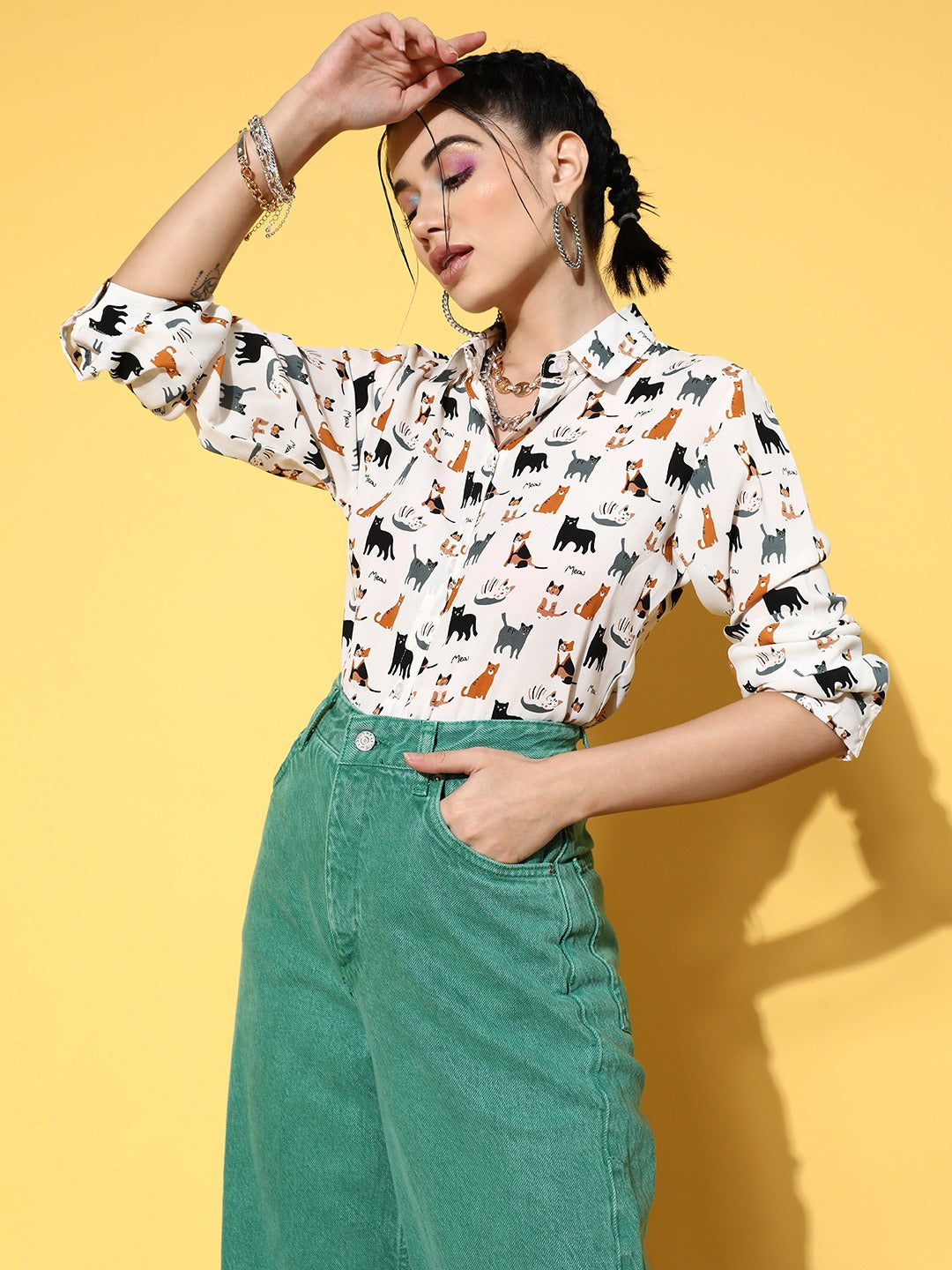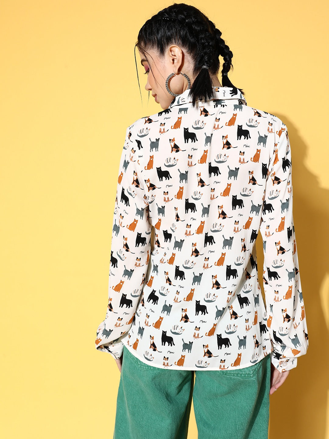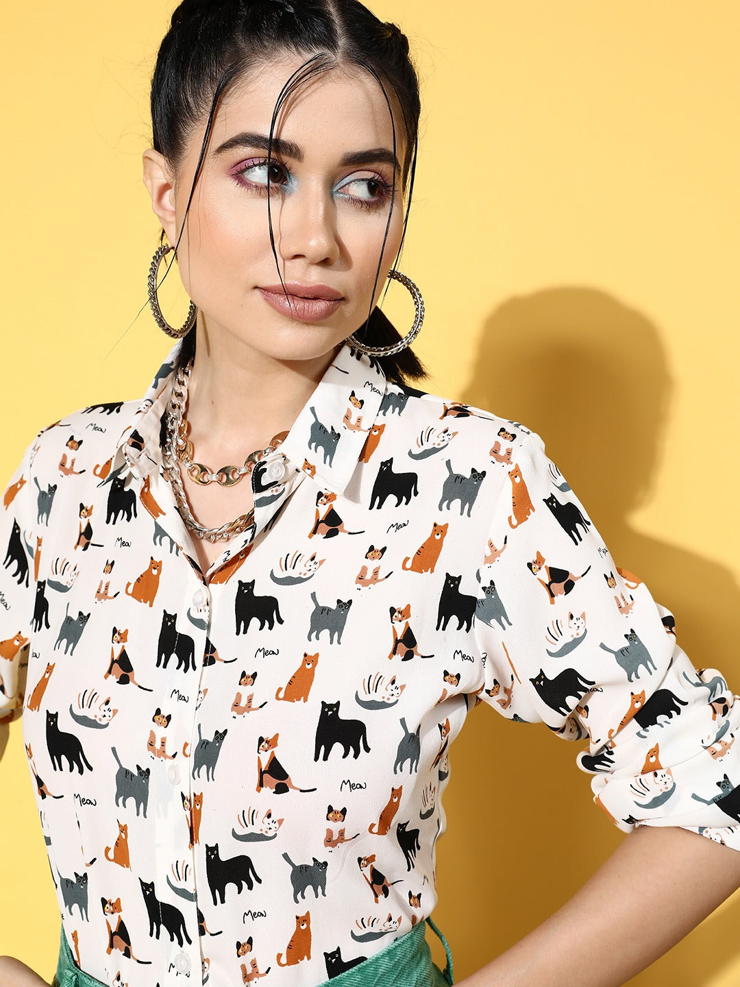 Berrylush Women White & Black Cat Print Spread Collar Neck Front Button-Up Straight Hem Regular Shirt