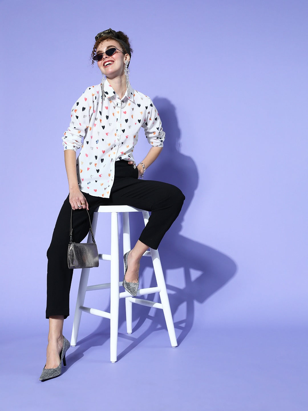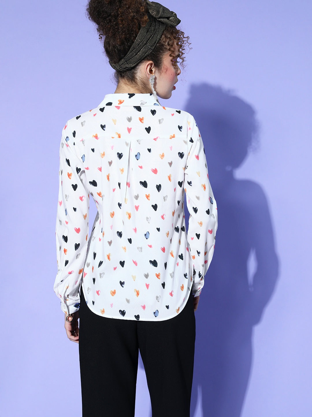 Get your day-to-day things done in a fashionable and cool way as the only thing you need is this sassy Berrylush Women White Heart Printed Spread Collar Neck Front Button Curved Hem Regular Shirt designed by Berrylush. This shirt flaunts a beautiful duo of white shade and a cute heart design that adds cheerfulness to your look along with a playful vibe. Presenting long-regular sleeves that lend your arms appropriate coverage and also assemble a contemporary style of this shirt. Not only that, this shirt comes in regular length and fit to get a sophisticated look. Partner up this casual shirt with black trousers, tassel earrings, a pair of block heels, and a classy side bag for a captivating appearance.