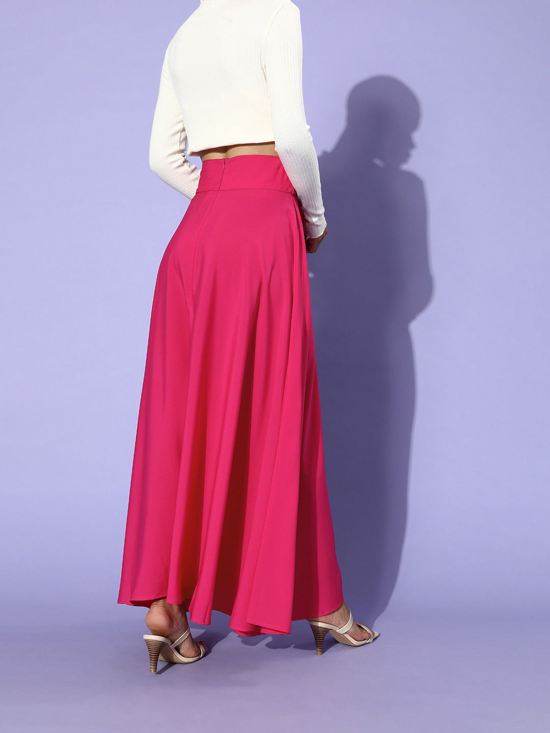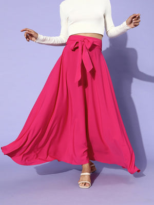 Berrylush Women Solid Pink Flared Waist Tie-Up Maxi Skirt