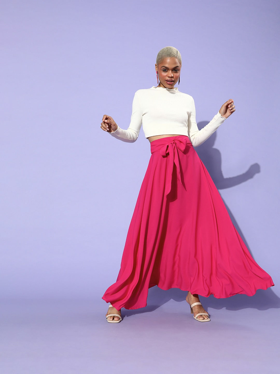 When you find yourself in utmost doubt, grab this Solid Pink Flared Waist Tie-Up Maxi Skirt from Berrylush. A mesmerizing pink coloured long maxi skirt that comes with an interesting flare hemline. Be it a special hangout session or an evening party outing this maxi skirt is going to be a snappy outfit for your party wear bottom choice. The free-flowing long flares bring a smooth bounce to your steps. Walk-in style at your party night with the A-line design and show how modish your aesthetics could be! With the waist tie-up knot, your waistline attains an excellent aura. Match this awesome pink skirt with high stilettos and rock your party night with Berrylush.