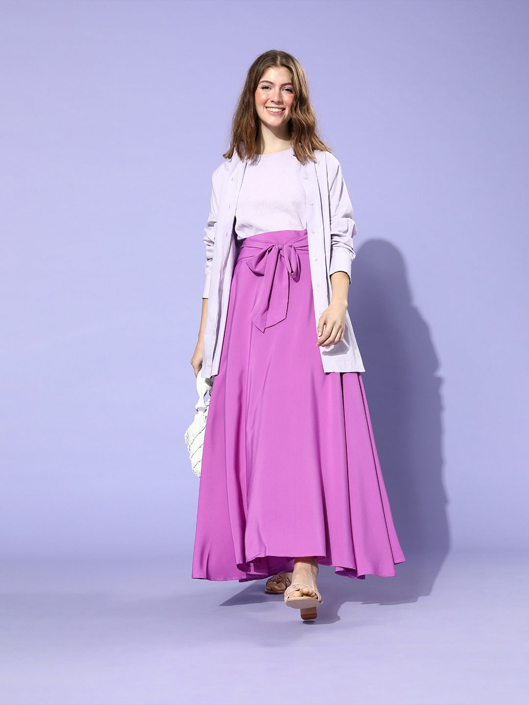 Berrylush Women Solid Purple Waist Tie-Ups Flared Maxi Skirt