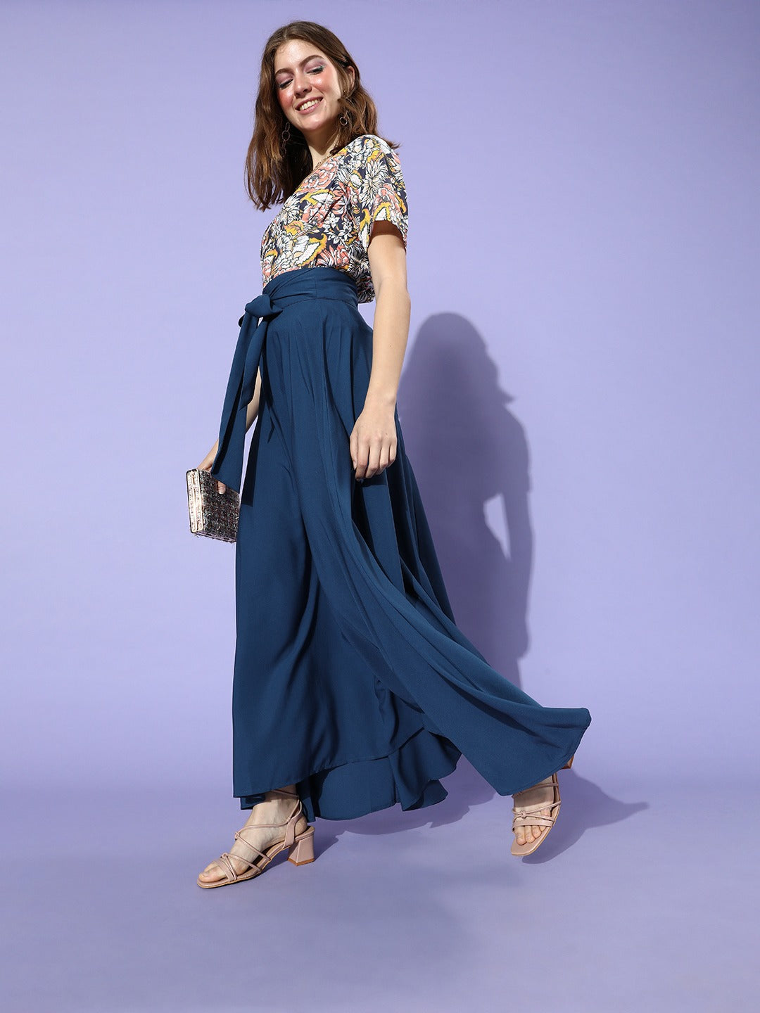 Berrylush Women Solid Blue Waist Tie-Ups Flared Maxi Skirt