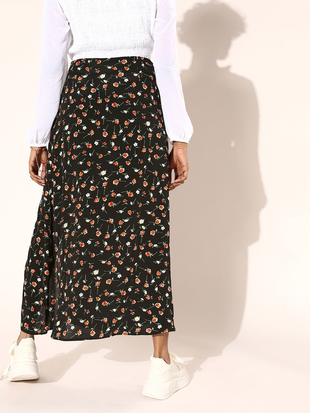 Berrylush Women Black Ditsy Floral Printed Thigh-High Slit Straight Midi Pencil Skirt