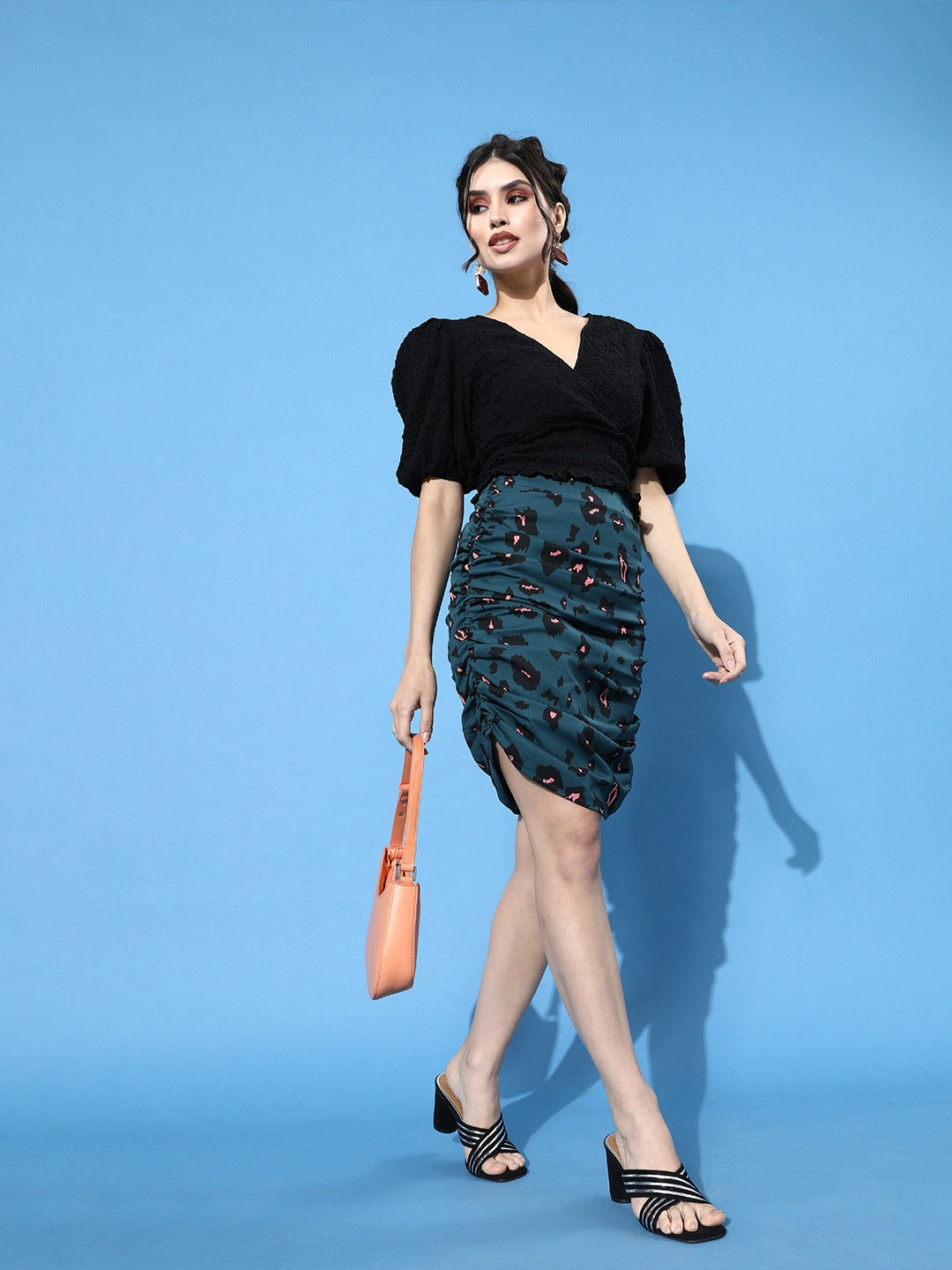Berrylush Women Green & Black Animal Ruched Mini Skirt