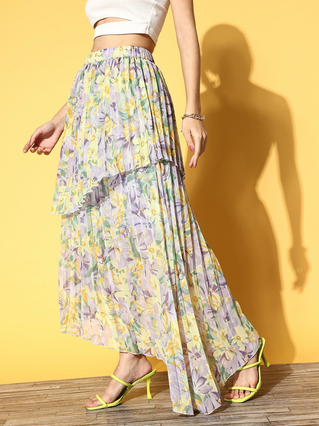 Berrylush Women Purple & Yellow Floral Printed Slip-On Elastic Waist Georgette Pleated Maxi Skirt