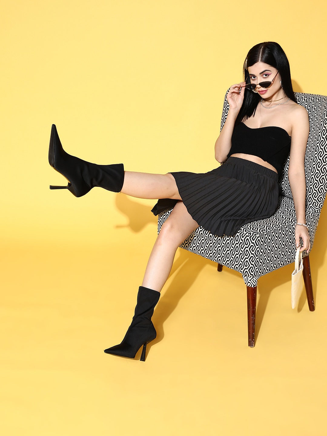 Berrylush Women Solid Black Elastic Waist Accordion Pleat Slip-On Flared Mini Skirt
