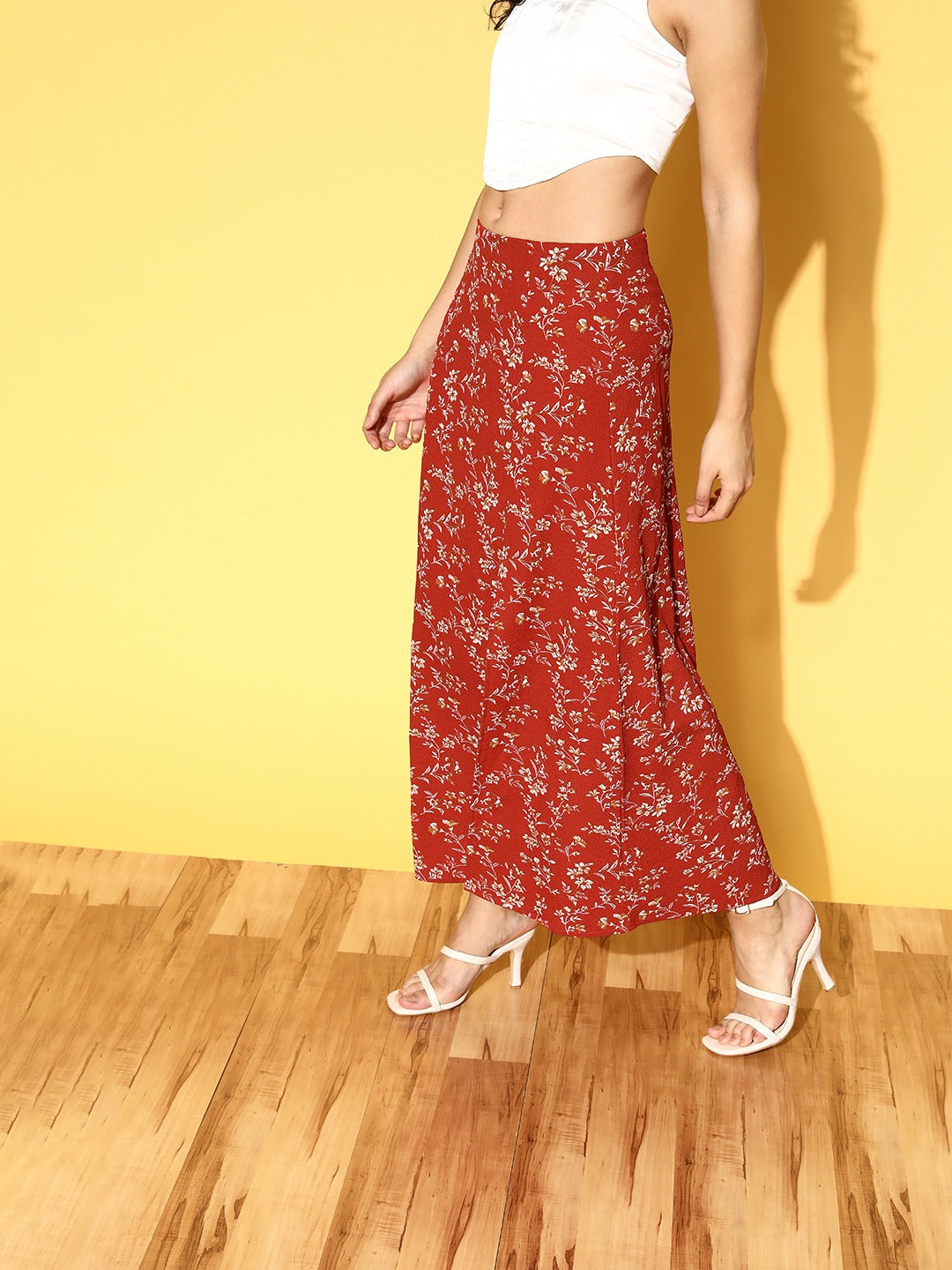 Berrylush Women Red & White Floral Printed High-Rise Waist Side-Slit Flared A-Line Maxi Skirt