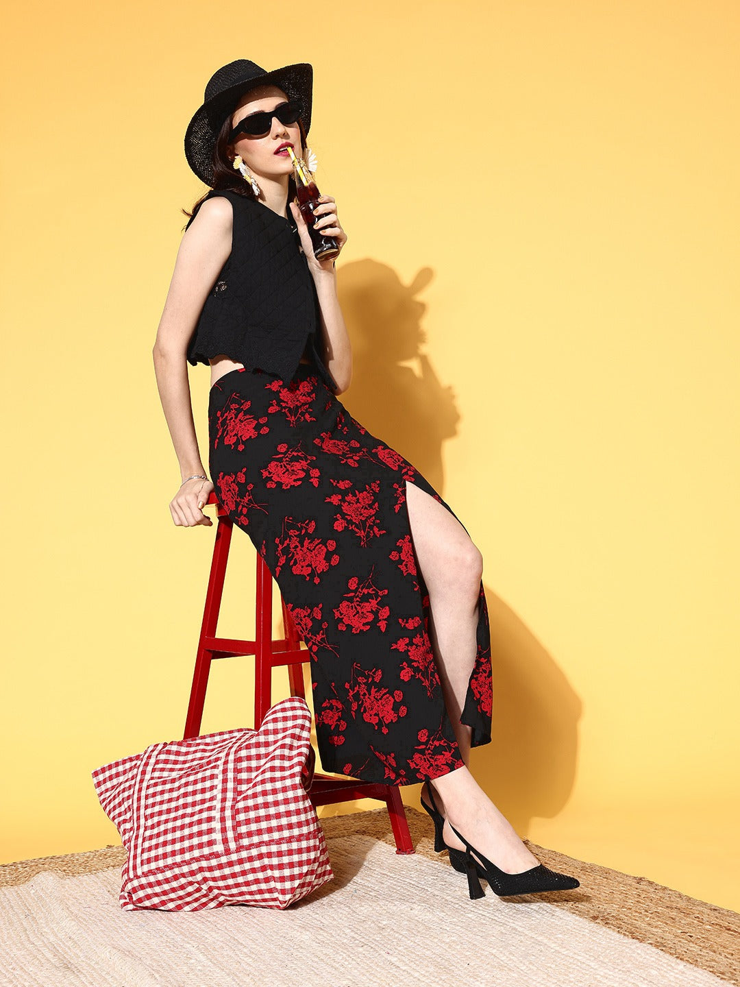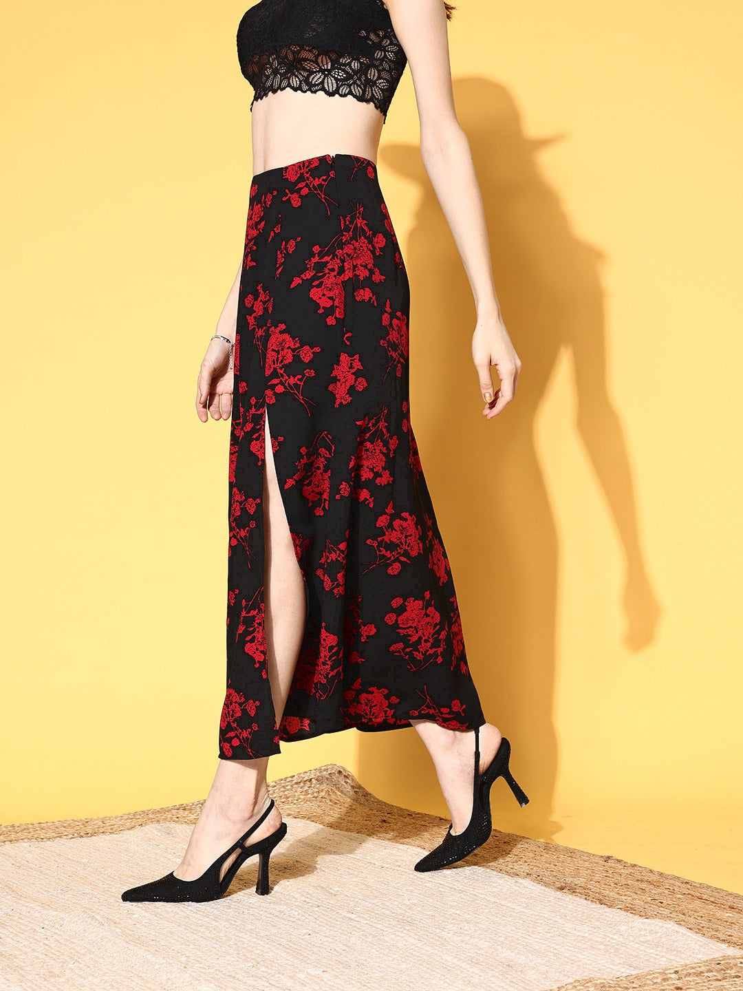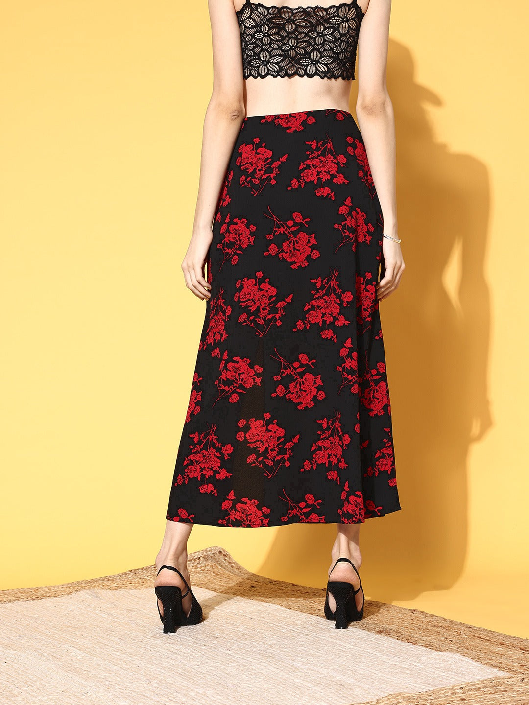 Imbue bold and sassy ascent in your casual assortment by opting for this beautiful Black & Red Floral Printed Thigh-High Slit Flared A-Line Midi Skirt designed by Berrylush. Tailored in the flared hemline to give this skirt sartorial perfection with a textured sheen. Rendered from high-quality crepe polyester fabric to offer excellent breathability features with quick drying properties. Fashioned with a high-rise waist that emphasizes your glamorous feminine shape by gracefully defining your curves. Also, the woven detailing adds smart structural integrity to this skirt with a smart appearance. Club this admirable skirt with a solid top, a stylish pair of wedges, hoop earrings, and a classy side bag to complete the look.