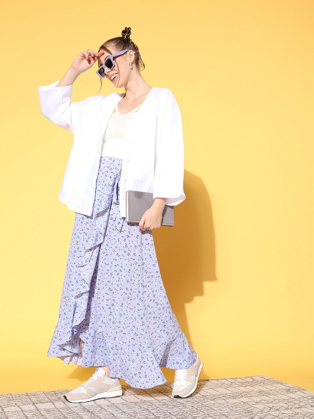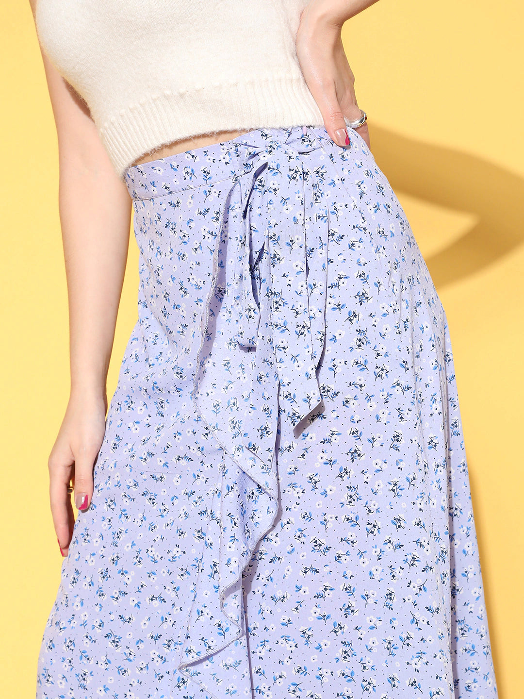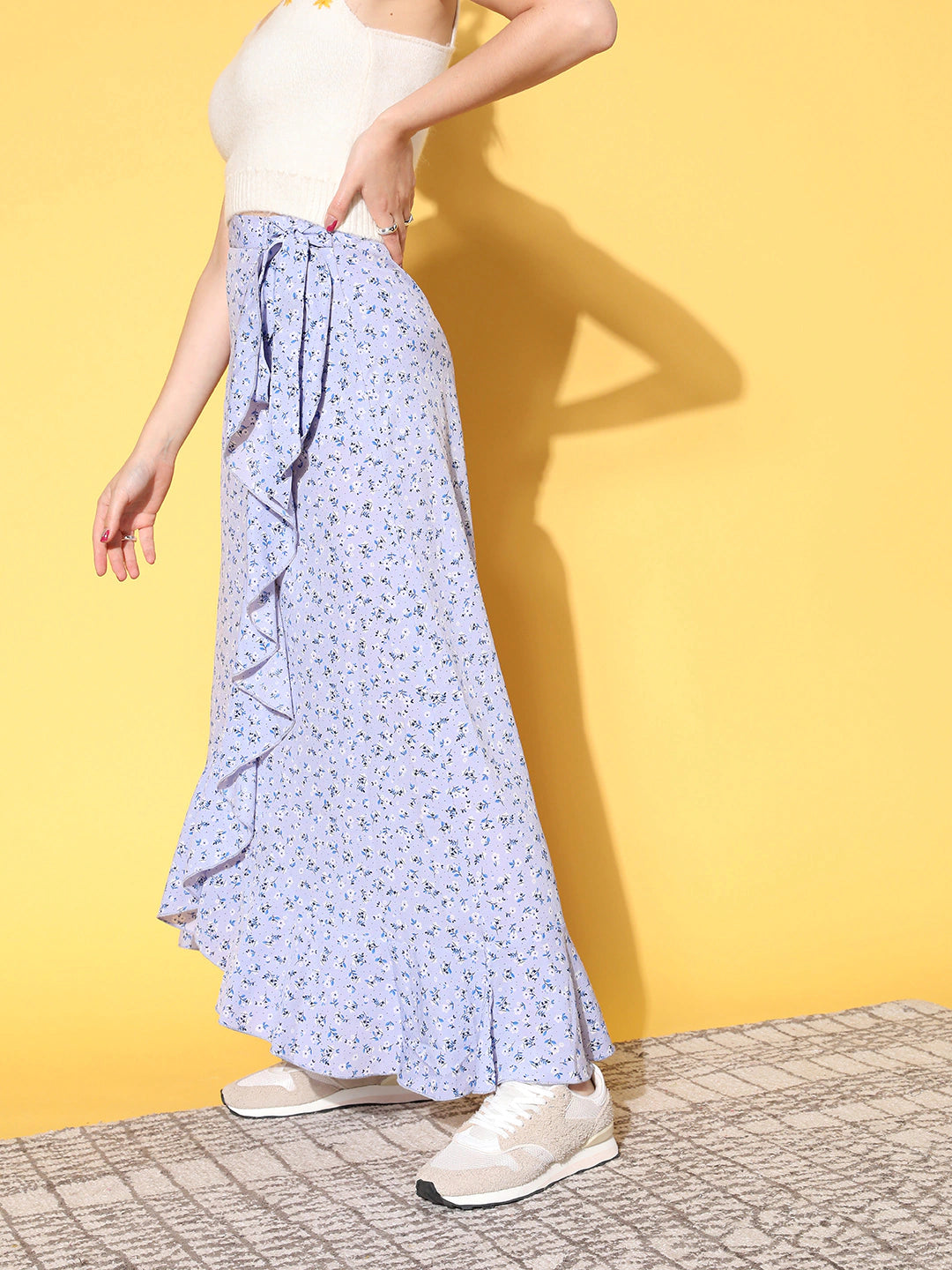 Berrylush Women Blue & White Floral Printed Tie-Up Waist Crepe Ruffled A-Line Wrap Maxi Skirt