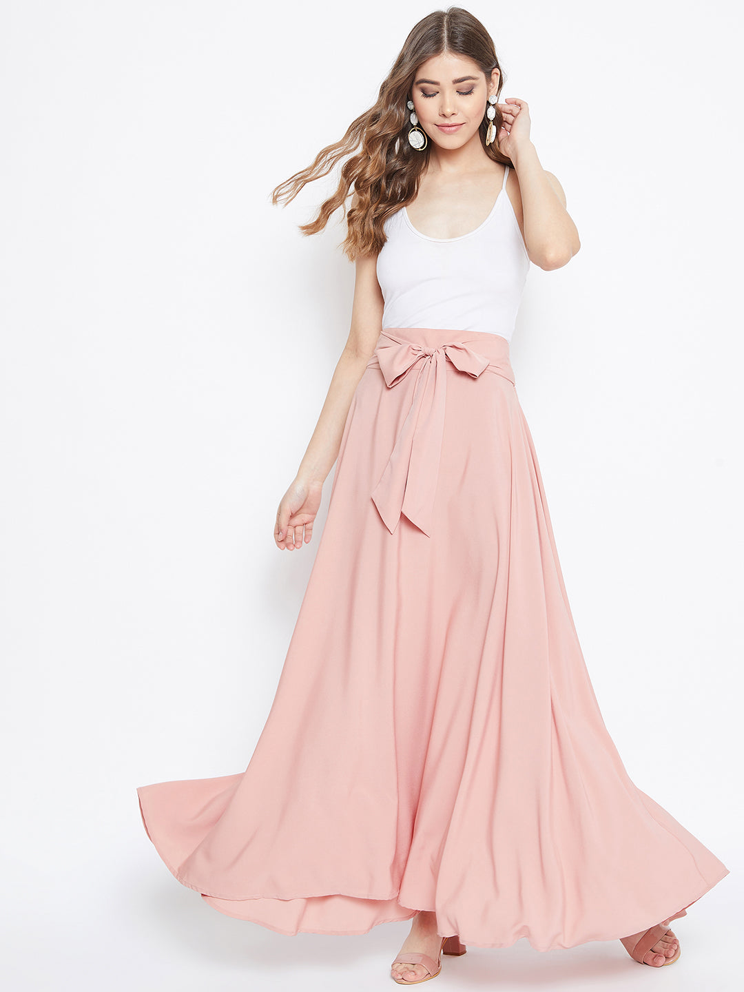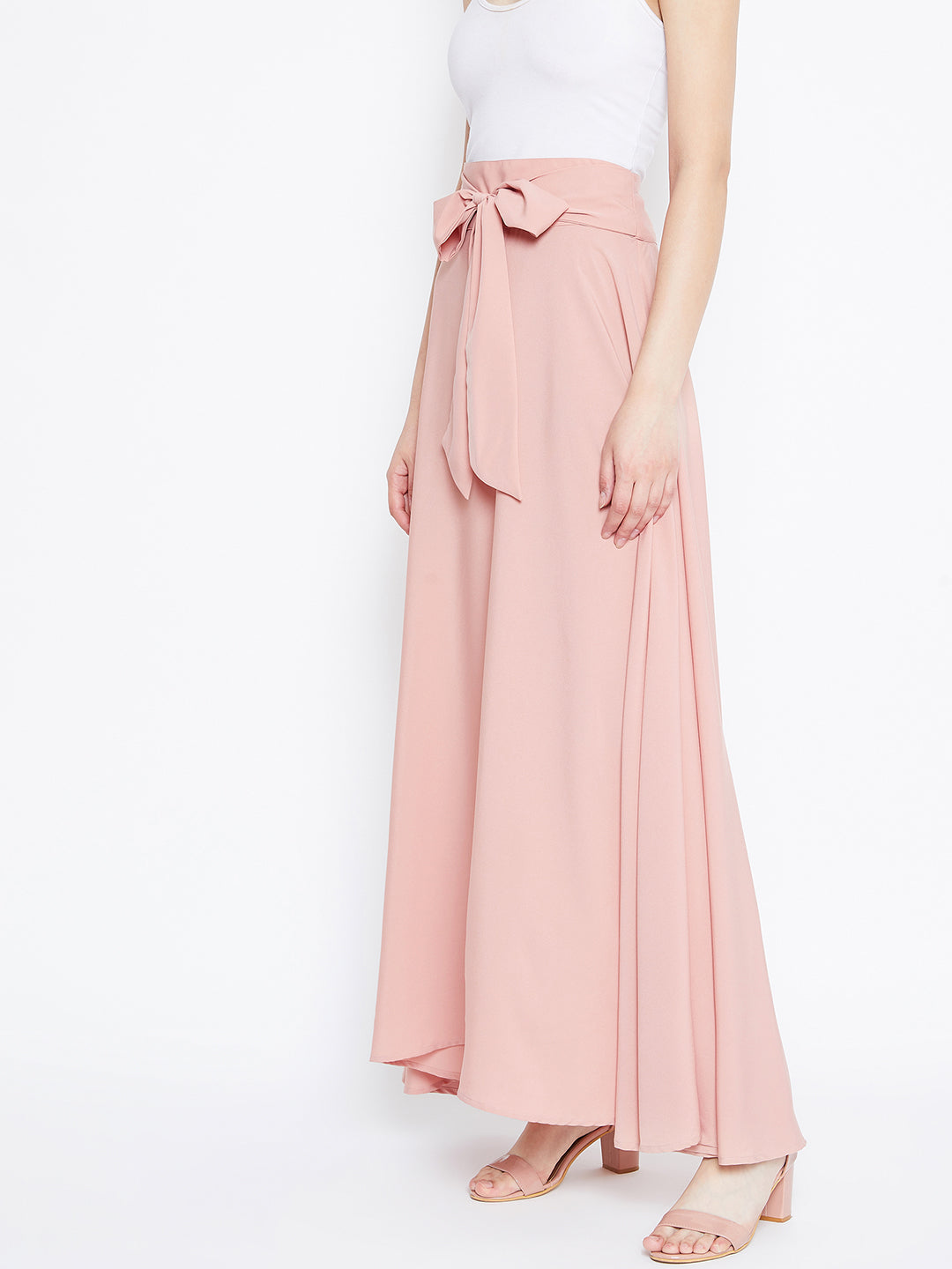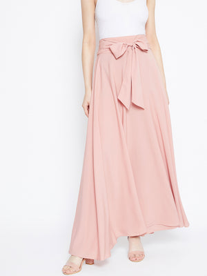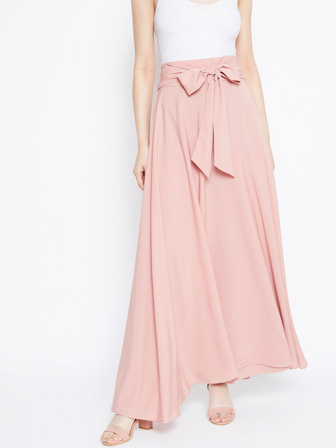Berrylush Women Solid Pink Waist Tie-Up Flared Maxi Skirt