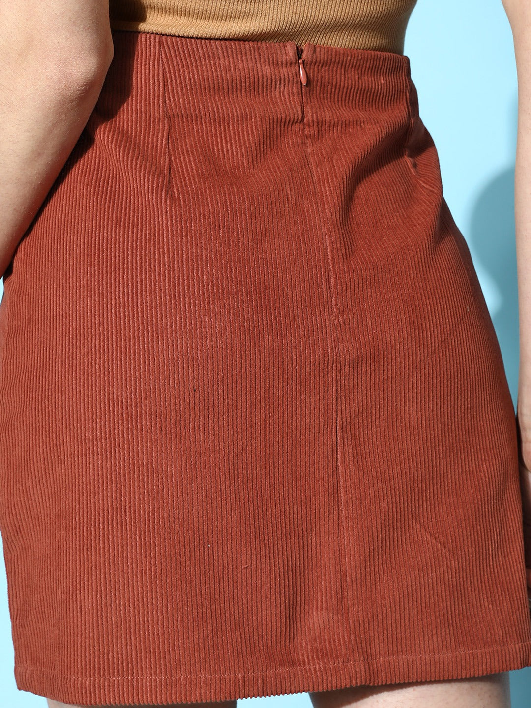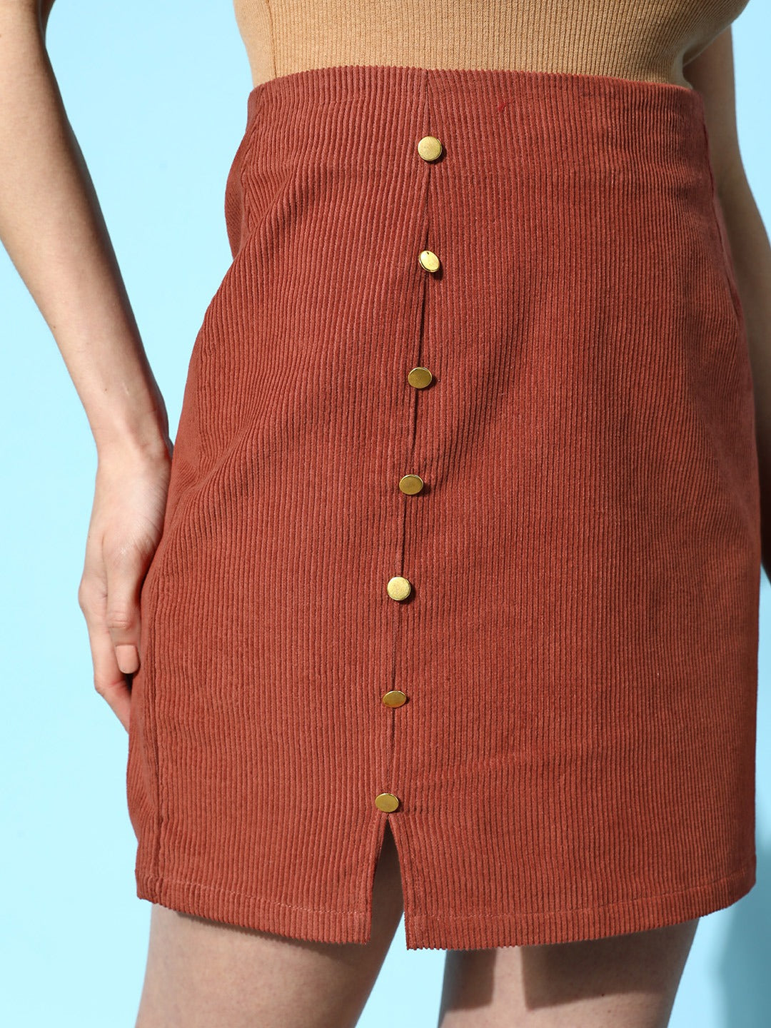 Berrylush Women Solid Brown High-Rise Waist Cotton Corduroy Straight Hem Button Embellished Mini Skirt