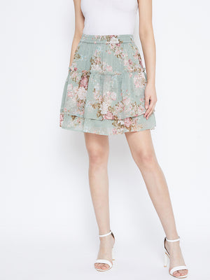 Berrylush Women Green Floral Print Layered Mini Skirt
