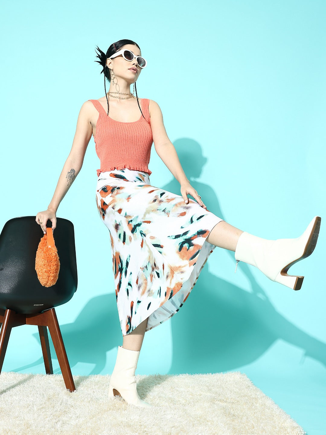 Be unapologetically you by embracing your body and fashion preference with this adorable White & Multicolour Abstract Printed High-Rise Waist Flared A-Line Midi Skirt introduced by Berrylush. Decorated with a beautiful mixture of white shade and multicolour abstract print throughout that gives this skirt a pretty appearance with the essence of nature's beauty and spring vibe. Spotlighting high-rise waist that injects an enticing style note to this skirt and exotic charm to your look. Made from exclusive quality satin polyester fabric that offers this skirt astonishing shape retention feature with low maintenance. Get a fabulous look to go on an outdoor date by teaming this midi skirt with your favourite top, comfy sandals, floral hoop earrings, and a trendy shoulder bag.