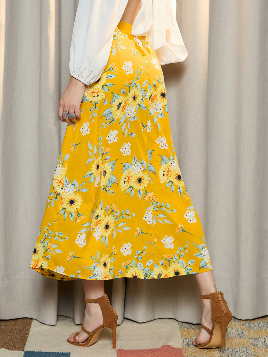 Introducing the Berrylush Yellow & Green Floral Print Midi Skirt—a vibrant blend of style and comfort for your casual wardrobe. This A-line skirt features a lively yellow and green floral print that captures the essence of spring. Crafted from smooth, woven polyester, it offers a flattering high-rise waist and an easy slip-on design for effortless elegance. The chic thigh-high slit adds a hint of allure while ensuring freedom of movement. With its straight hemline reaching midi length, this skirt promises both coverage and charm for any daytime outing or relaxed evening event. Step into nature's palette with Berrylush's charming creation!