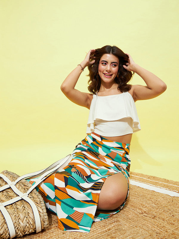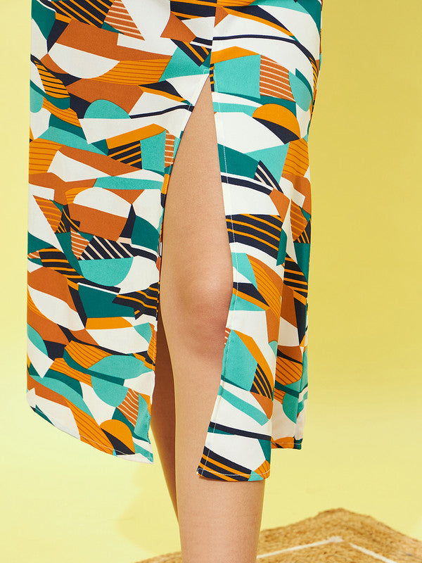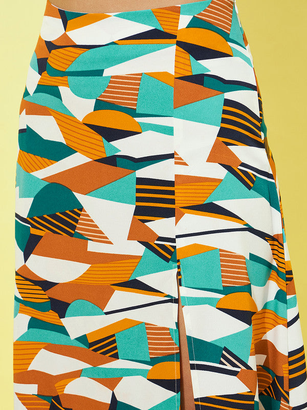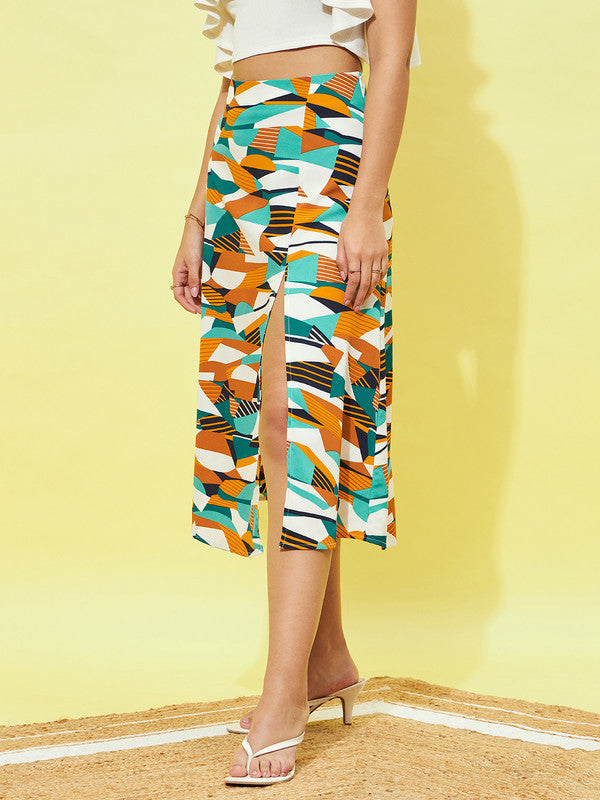 Berrylush Women Teal, Orange, & White Abstract Printed Crepe Thigh-High Slit Flared A-Line Midi Skirt