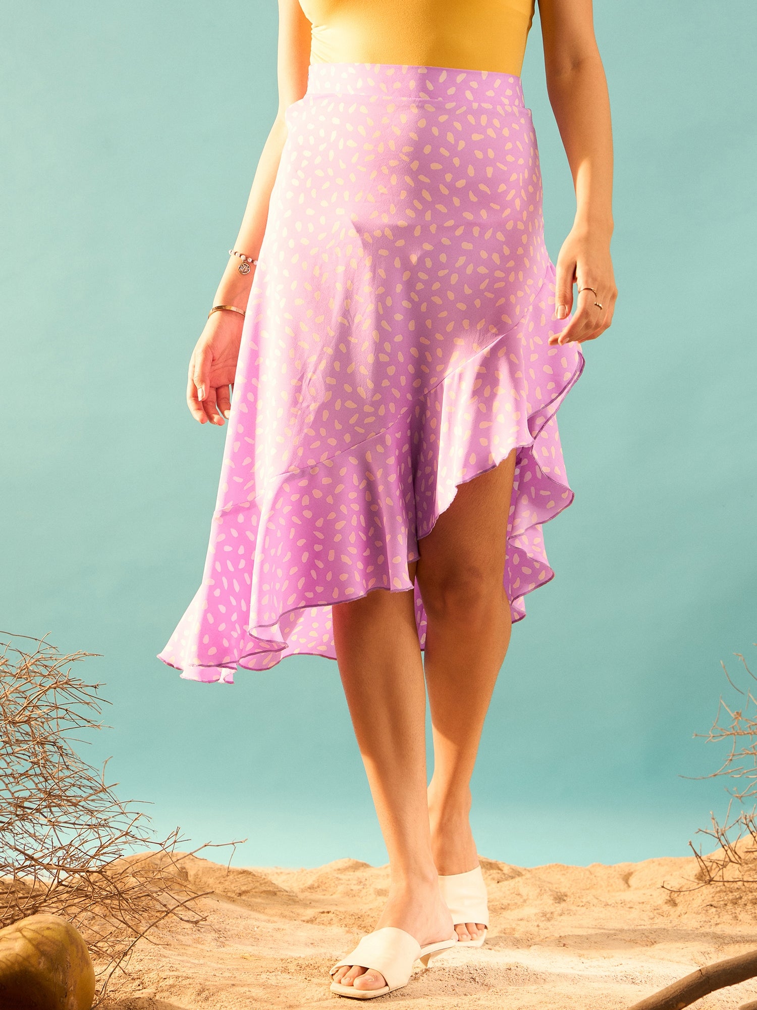 Unveil your vibrant style with Berrylush's Purple & White Abstract Printed Wrap Midi Skirt, perfect for sprucing up any casual occasion. Impeccably crafted from luxurious crepe fabric, this skirt showcases an eye-catching abstract pattern in delightful purple and white hues. The high-rise waist flatters your silhouette while the innovative asymmetrical hem adds a modern twist to its midi length. Thoughtfully designed as a slip-on piece with woven detailing and an opaque finish, this wrap skirt ensures both comfort and chic elegance in every step you take.