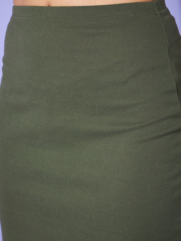 Berrylush Women Solid Olive Green High-Rise Waist Slip-On Straight Hem Knitted Pencil Mini Skirt