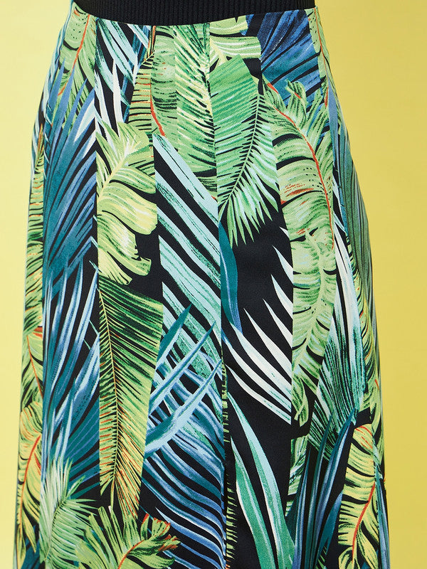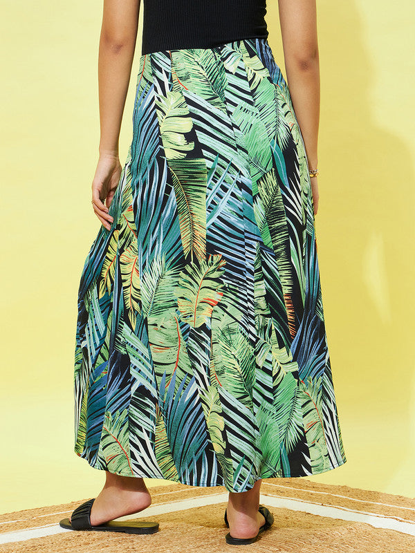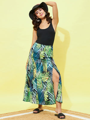 Berrylush Women Black & Green Tropical Printed High-Rise Waist Straight Hem Thigh-High Slit A-Line Maxi Skirt