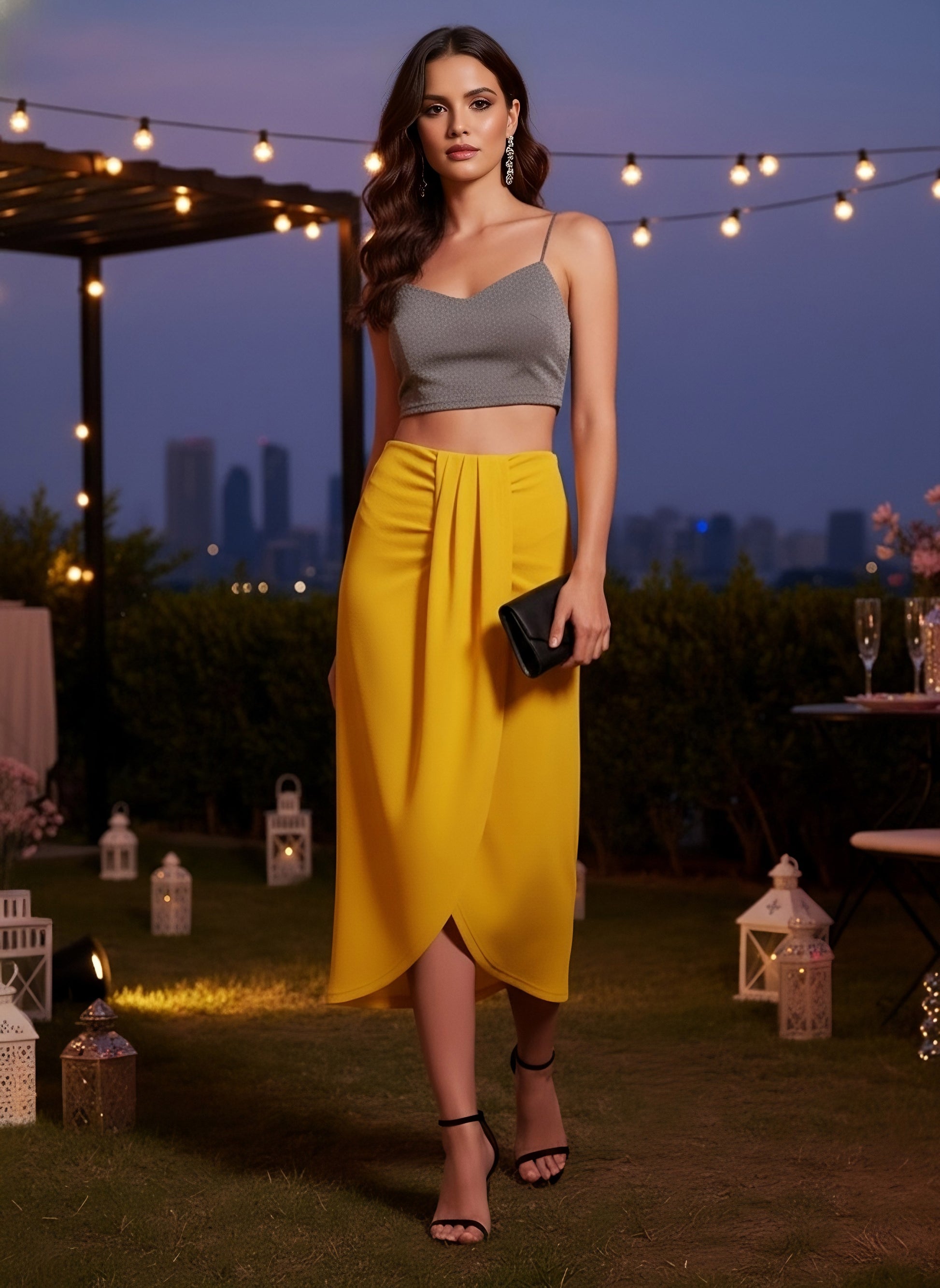 Berrylush Women Yellow Solid High Rise Knitted Draped Tulip Skirt