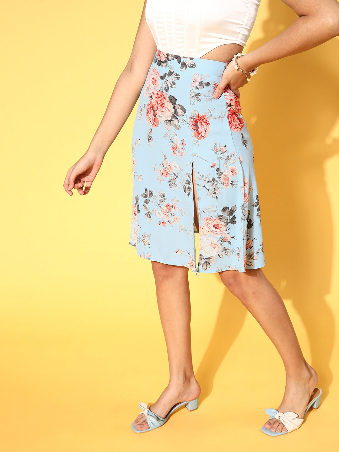 Keep your style refreshing and cool while the temperature rises this summer by donning this fabulous Blue & Red Floral Printed Thigh-High Slit Flared A-Line Midi Skirt from Berrylush. Rendered from crepe polyester fabric that offers an easy shape retain feature with total airflow which makes this skirt a suitable outfit to wear for a prolonged duration on hot days. Styled with woven detailing as it gives this skirt a smart-constructed outline with enhanced durability by providing resistance to easy wear and tear issues. That's not all, the above-knee length of this skirt lends your legs convenient exposure that keeps them cool and cosy. Partner up this flared skirt with a trendy corset top, a pair of cute caged heels, and a pretty handbag to create a stunning look.