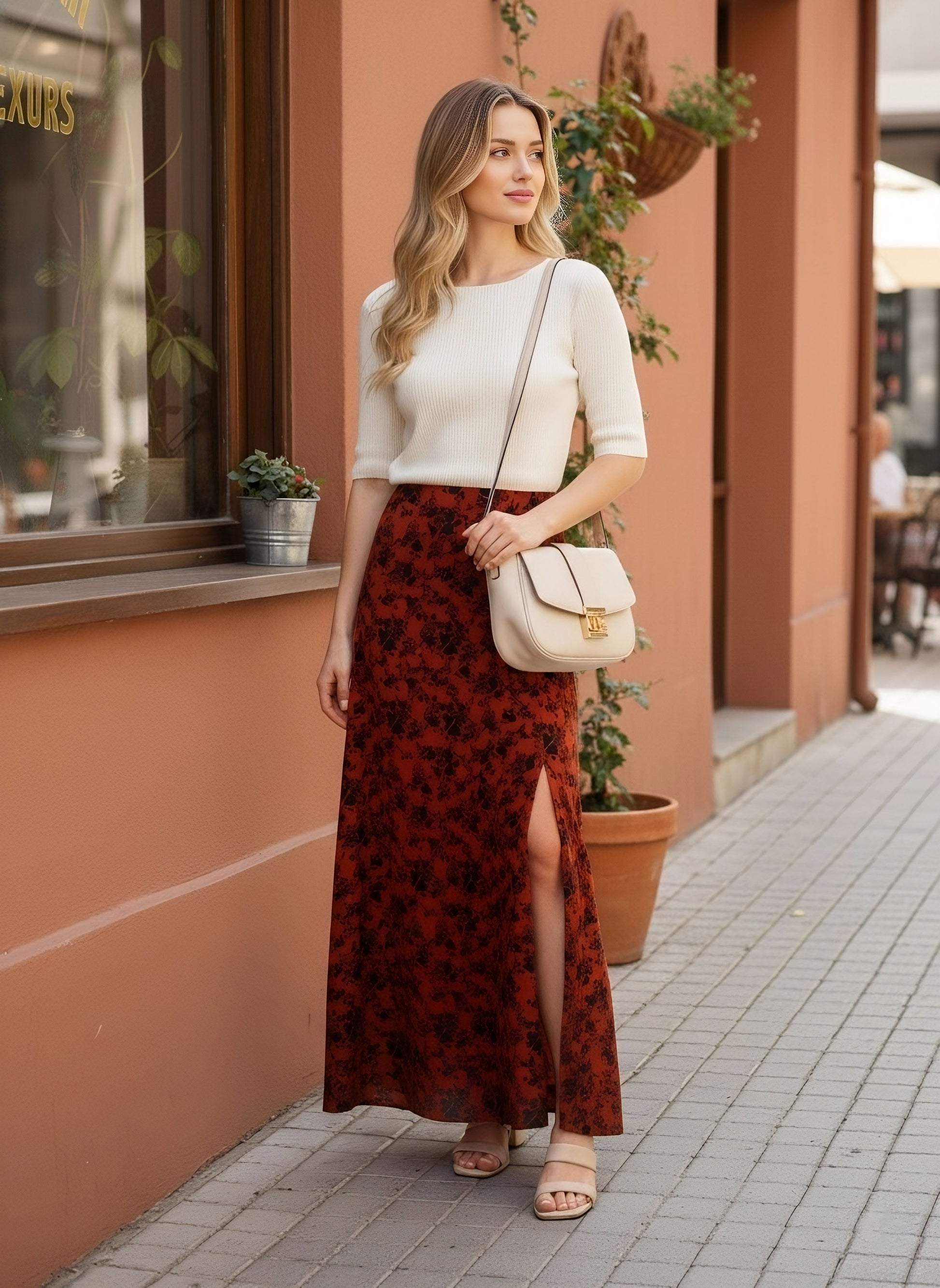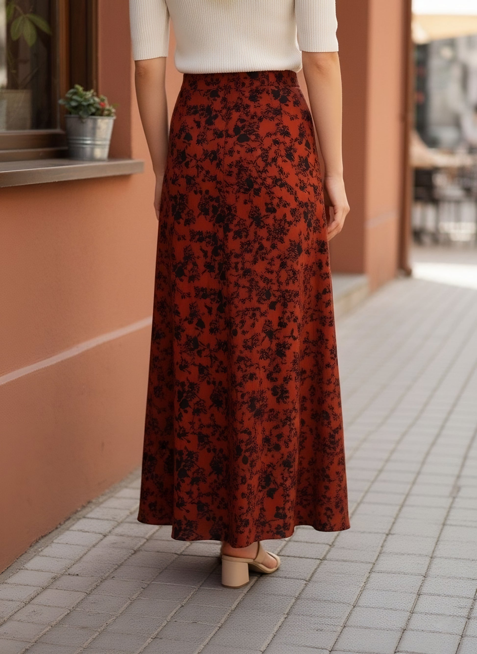 Berrylush Women Brown Floral Print High Rise A-Line Midi Skirt