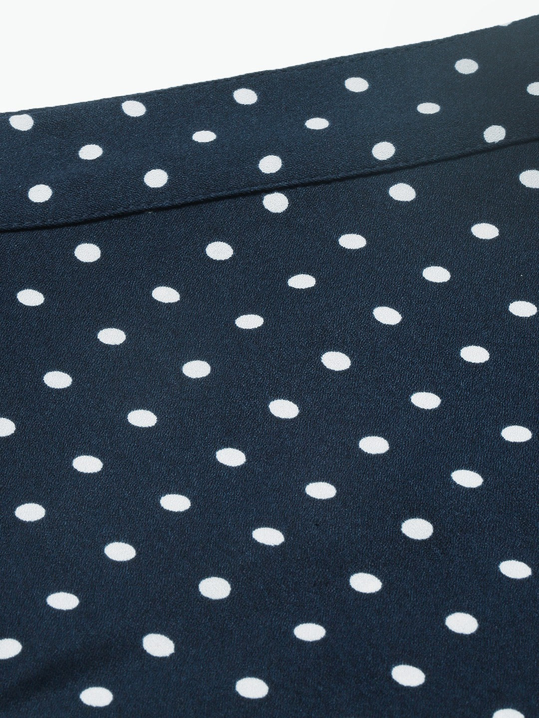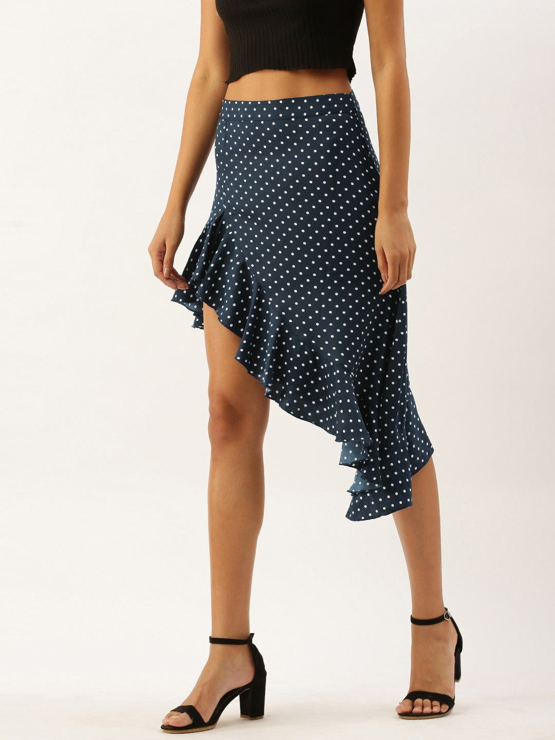 Bring out your charming vibes everywhere you go with this Navy Blue Polka Dot Asymmetrical Hem Ruffled Skirt from Berrylush. The high-end style of the polka dot pattern, designed over this pretty skirt adds a spectacular spark to your casual outfit. The banded waistline creates a fashion-triggered tucked-in effect. The asymmetric ruffle design serves the purpose of adding spice to your overall appearance. The polyester fabric helps to carry this outfit in a weightless manner and the zipper closure smartly takes care of the support element to your look. Style this stunning skirt with a black coloured crop top and strappy heels and create a new fashion code.